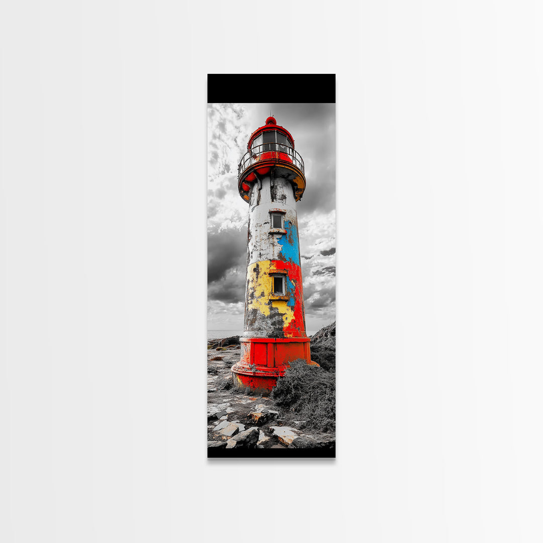 Colorful Lighthouse Decay, Rustic Coastal Charm, Bold Vintage, Stormy Skies, Framed Canvas Print Nautical Wall Art, Eclectic Decor