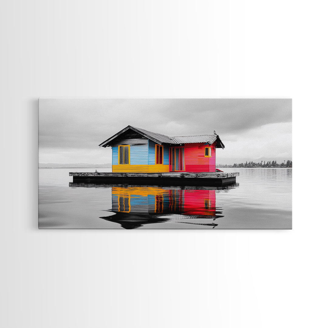 Colorful House, Lake Reflection, Floating Cabin, Framed Canvas Print, Vibrant Nautical Art, Living Room Wall Art, Modern Pop Color Decor