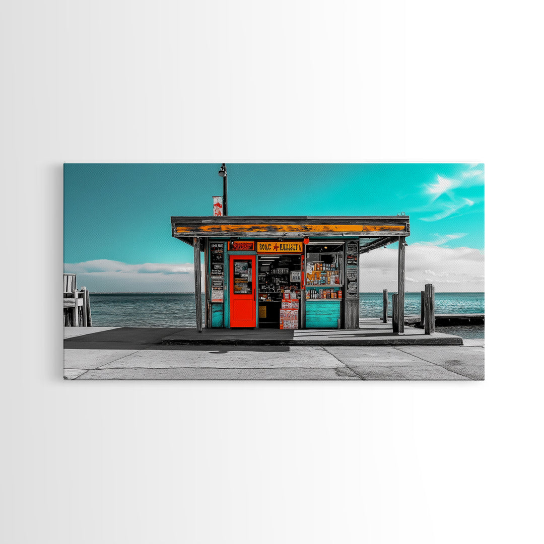 Colorful Market, Ocean Pier, Seaside Shack, Canvas Print, Beach Wall Art, Coastal Kitchen Decor, Bright Nautical Art Scene