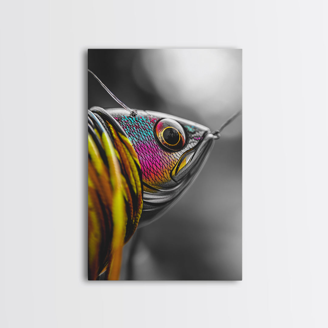 Colorful Lure, Fishing Hook, Bold Scales, Rainbow Detail, Framed Canvas Print, Man Cave Art, Fishing Decor, Vibrant Realism Wall Art