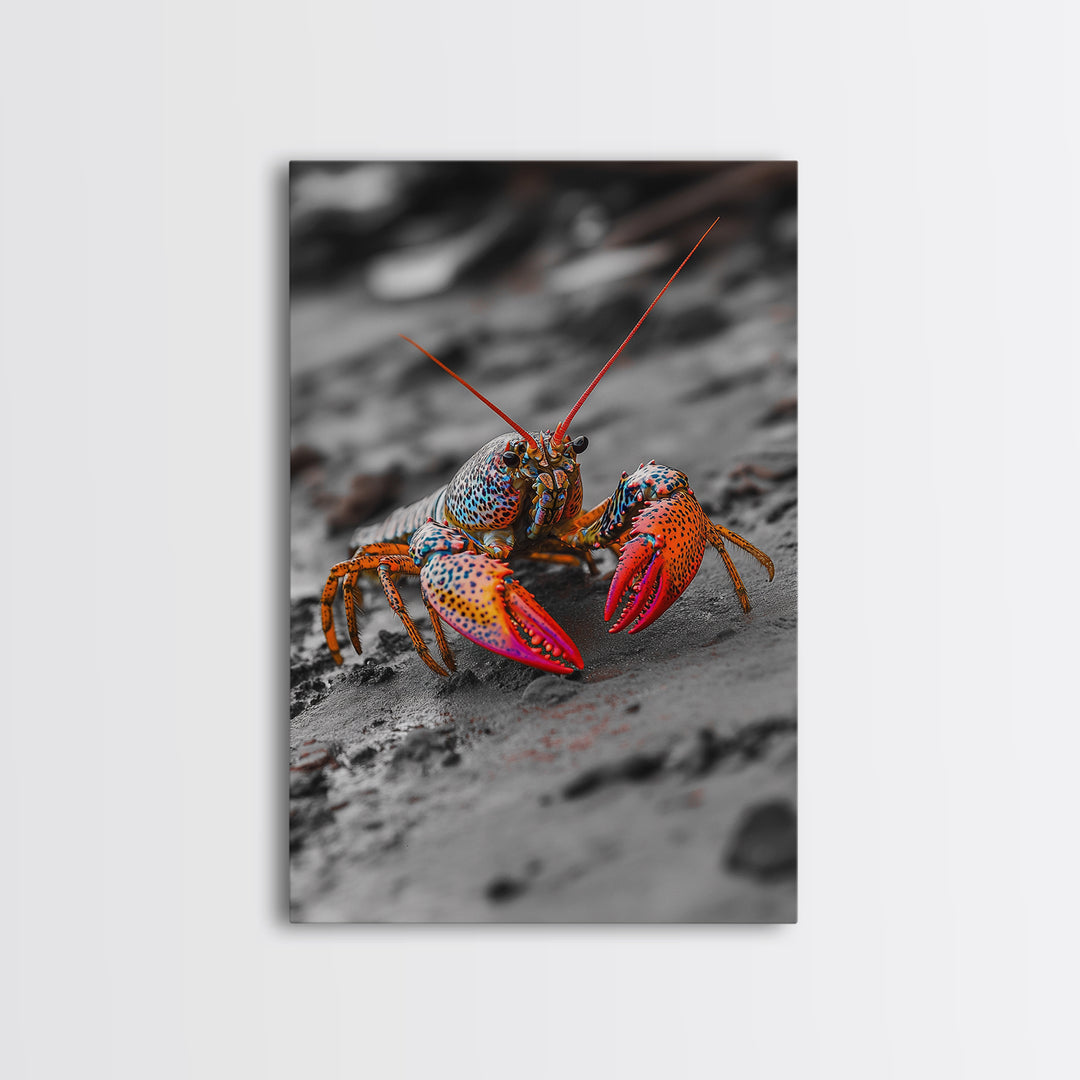 Colorful Lobster, Beach Wildlife, Close-Up Macro Art, Framed Canvas Print, Kitchen Wall Art, Coastal Marine Decor, Vibrant Style