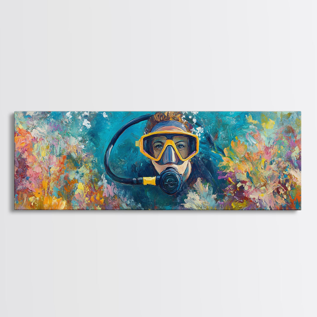 Colorful Scuba Diver Canvas Print Vibrant Ocean Art Tropical Coral Reef Painting Coastal Beach House Wall Art Underwater Decor