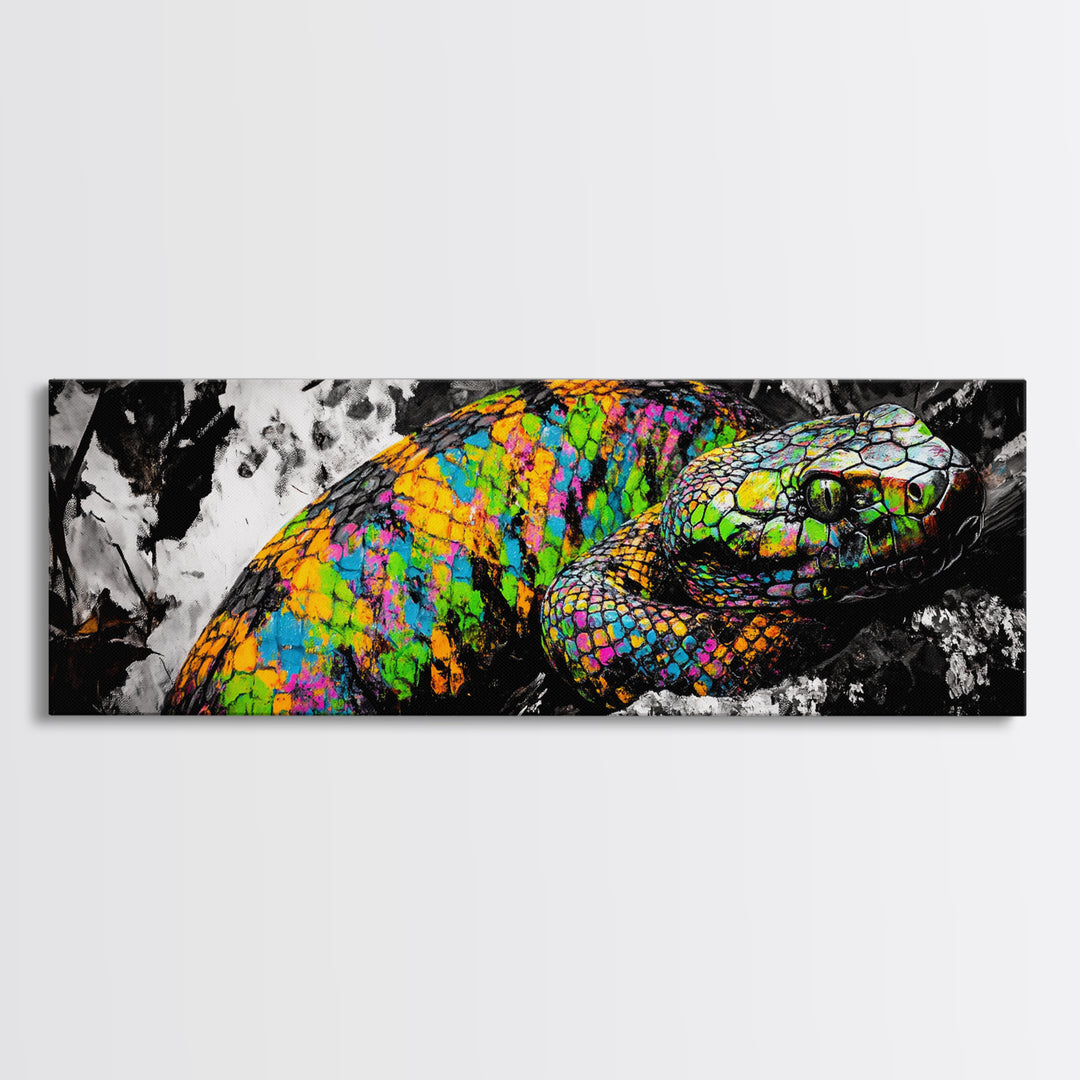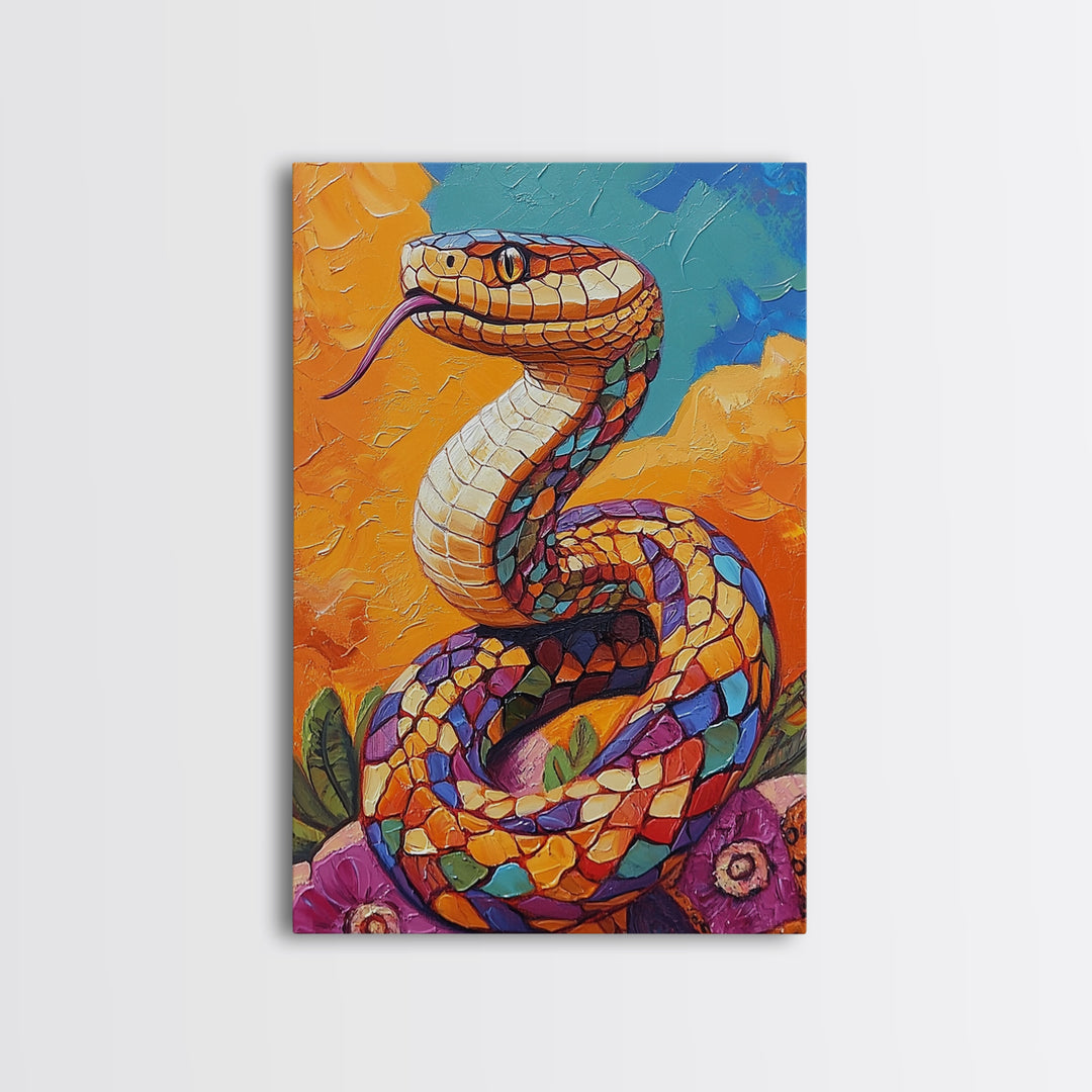 Colorful Snake, Psychedelic Reptile Art, Nature Painting, Wildlife Print, Vibrant Scales, Unique Wall Decor, Framed Canvas Print