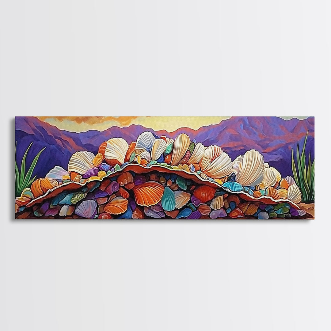 Colorful Shell Art, Coastal Mountain Decor, Ocean Nature Vibes, Beach Shell Wall, Framed Canvas Print, Living Room Coastal Boho Art