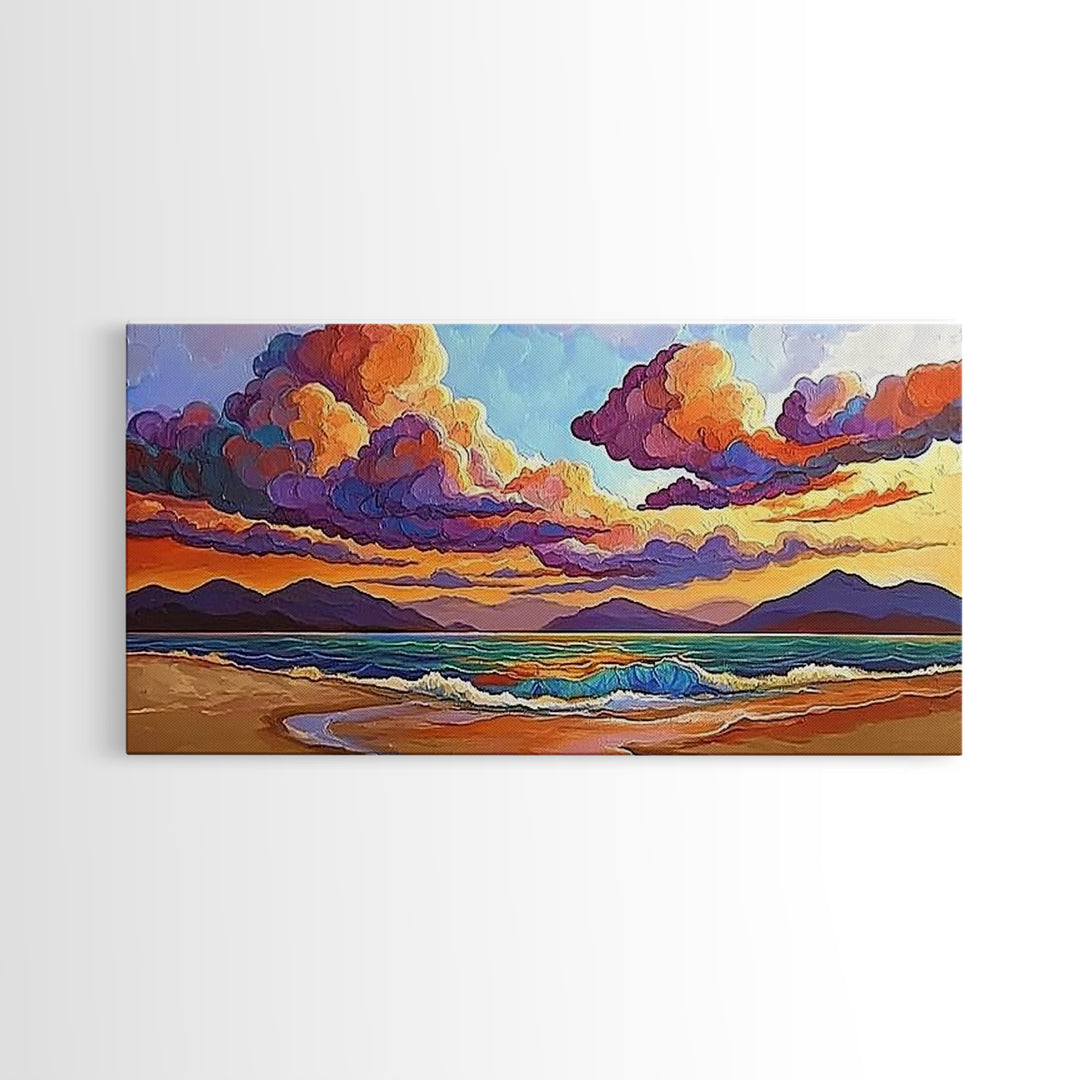 Colorful Sunset, Clouds, Mountains, Framed Canvas Print vibrant beach wall decor, sky and sea painting, boho art, coastal living room