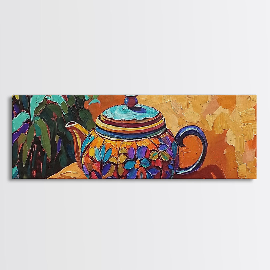 Colorful Teapot, Folk Art, Kitchen Wall Art, Framed Canvas Print, Talavera Style, Warm Palette, Cottagecore Kitchen Decor