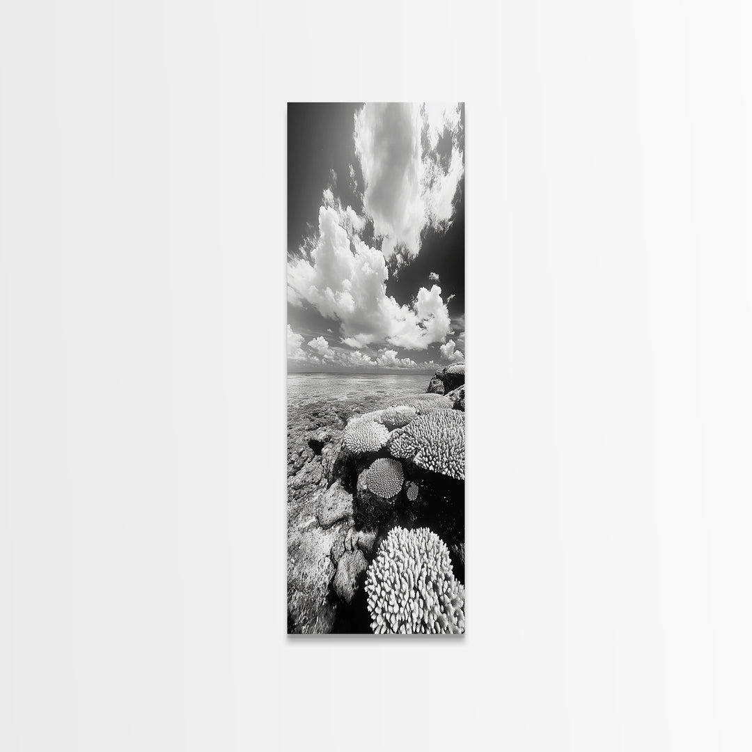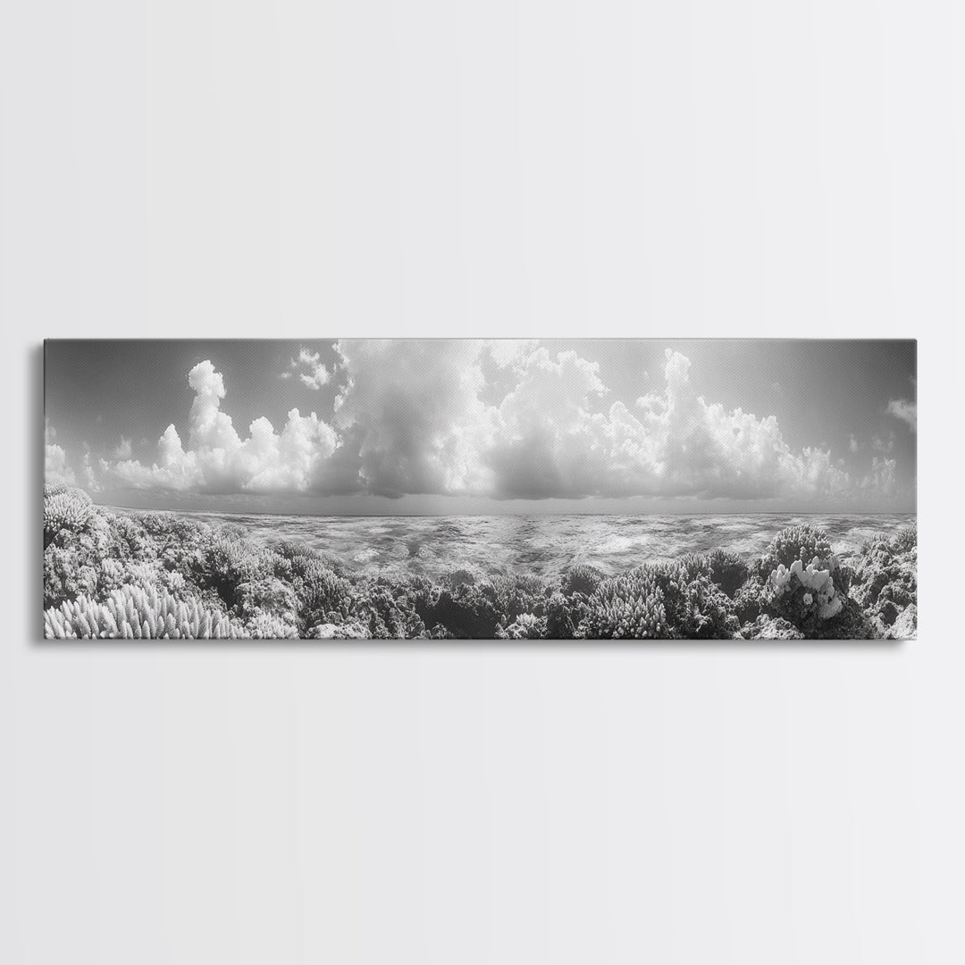 Coral Reef, Ocean Horizon, Puffy Clouds, Framed Canvas Print, Coastal Bathroom Art, Nautical Decor, Black and White Beach Style