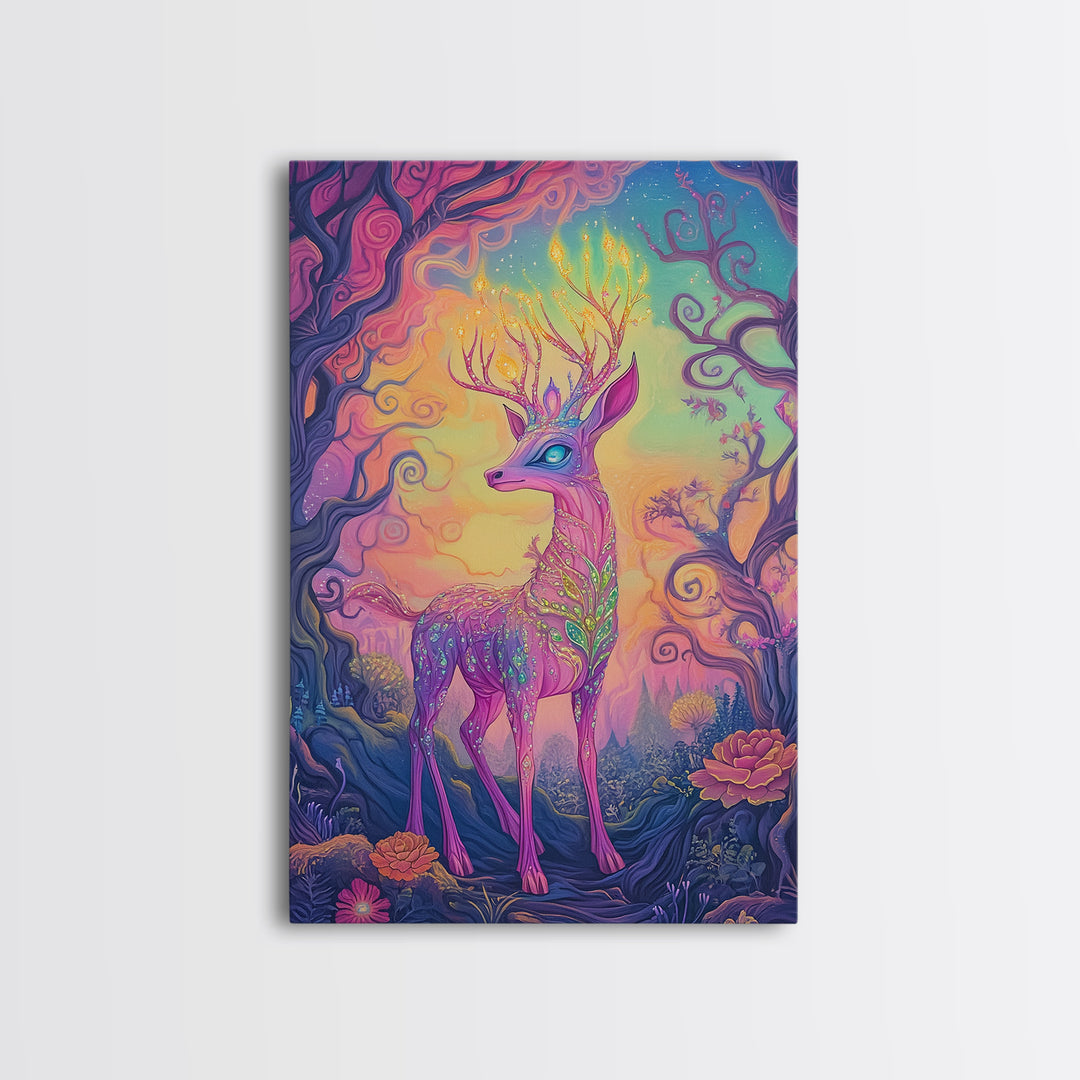 Cosmic Deer, Psychedelic Art, Vibrant Fantasy Animal, Whimsical Art, Cottagecore Wall Art, Bedroom Art, Framed Canvas Print