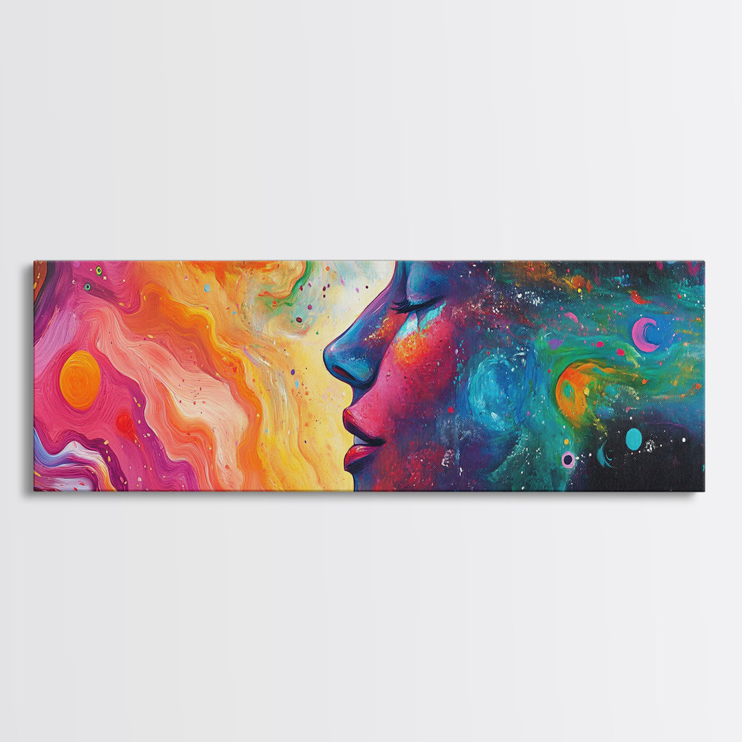 Cosmic Woman Profile Framed Canvas Print - Colorful Yoga Art, Bright Therapy Art, Moody Southwest Wall Art, Above Sofa Horizontal Decor