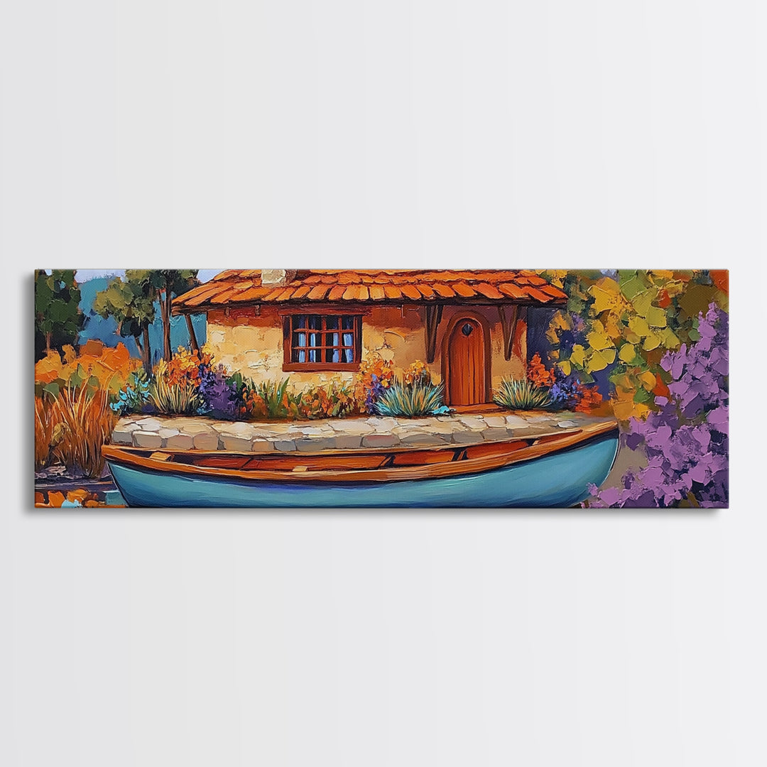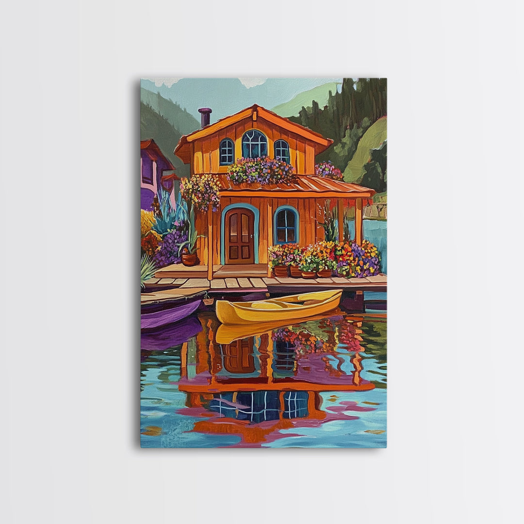 Cottage Boat House, Rustic Lakeside Art, Autumn Garden Scene, Framed Canvas Print, Cozy Kitchen Wall Art, Living Room Decor