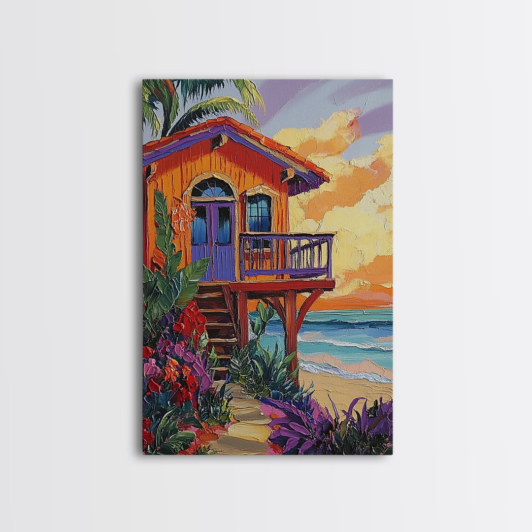 Cottage Beach, Garden, Sunset, Framed Canvas Print, coastal bungalow wall art, tropical floral decor, sunset boho home style, summer vibe