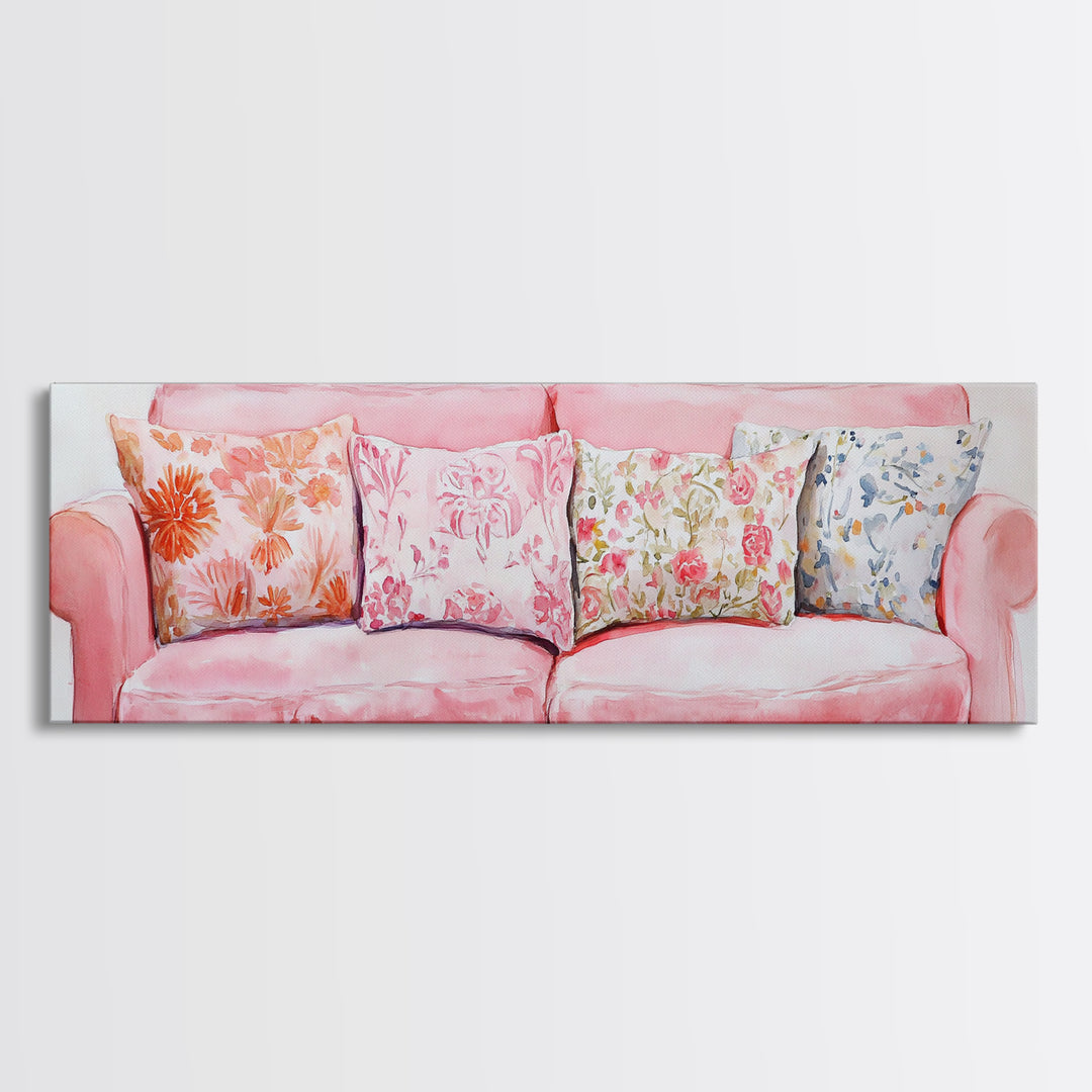 Couch Painting Framed Canvas Print with Floral Patterned Pillows, Cottagecore Living Room Art, Horizontal Above Sofa Decor