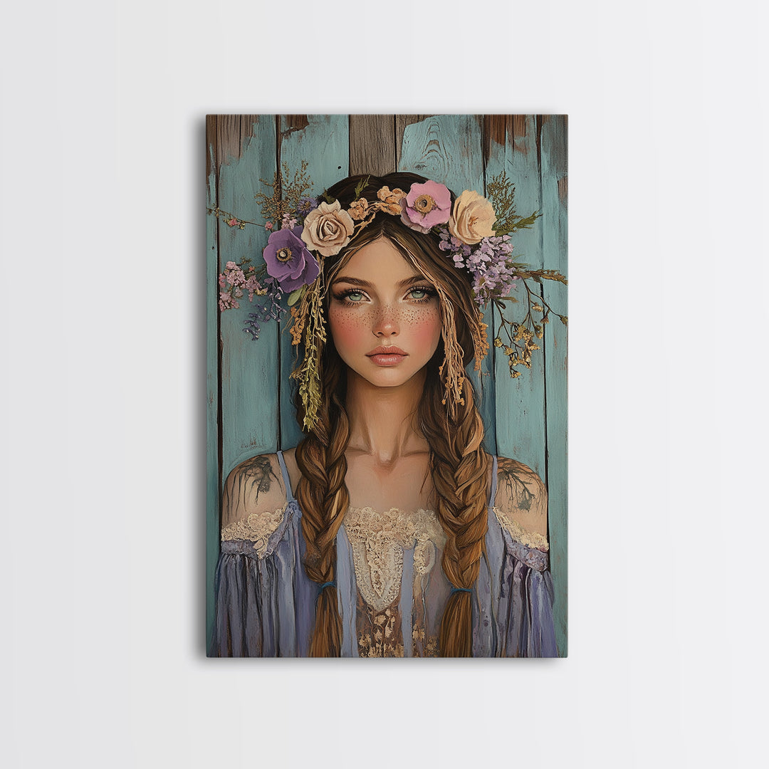 Cottagecore Framed Canvas Print with Braided Woman in Floral Crown, Farmhouse Wall Art, Bedroom Art, Rustic Decor, Gift Idea for Her