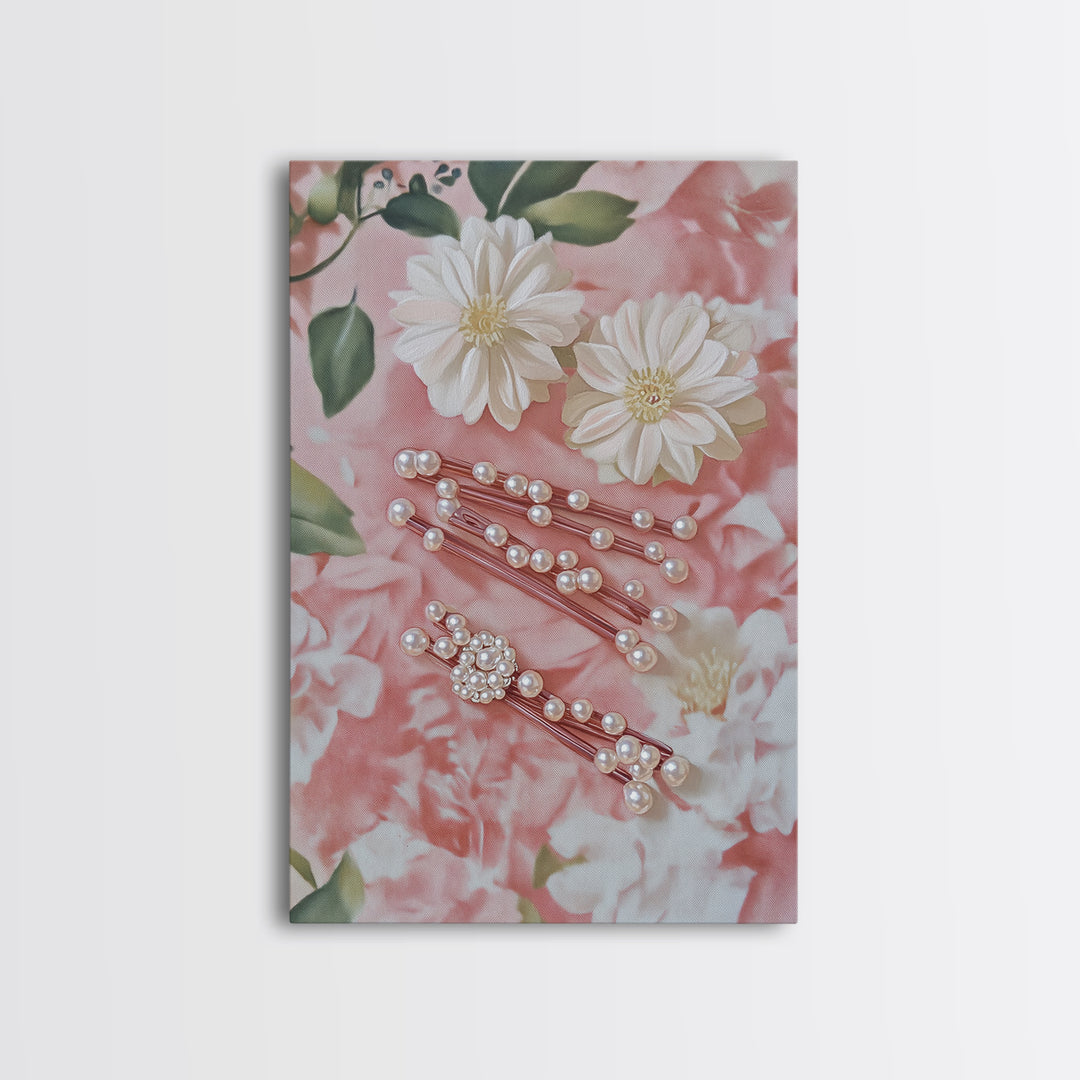 Cottagecore Hairpins Framed Canvas Print Featuring Rustic Decor Light Pink Wall Art Wildflower Painting Bedroom Living Room Artwork