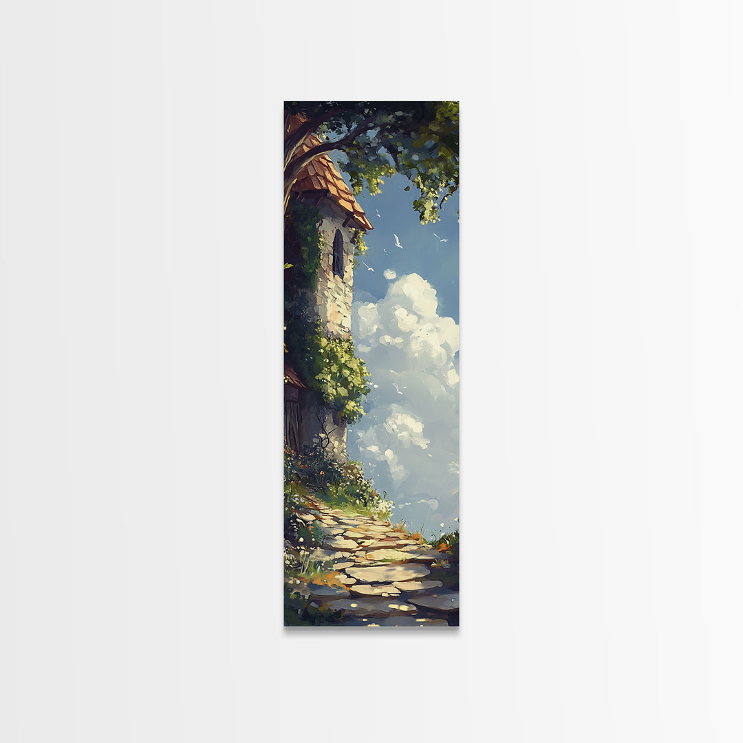 Cottage Tower, whimsical art, fairy tale painting, cottagecore wall art, rustic decor, framed canvas print, vertical wall art