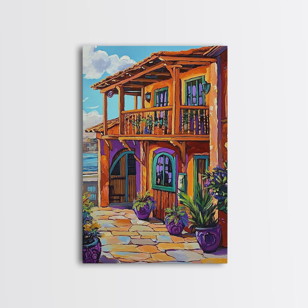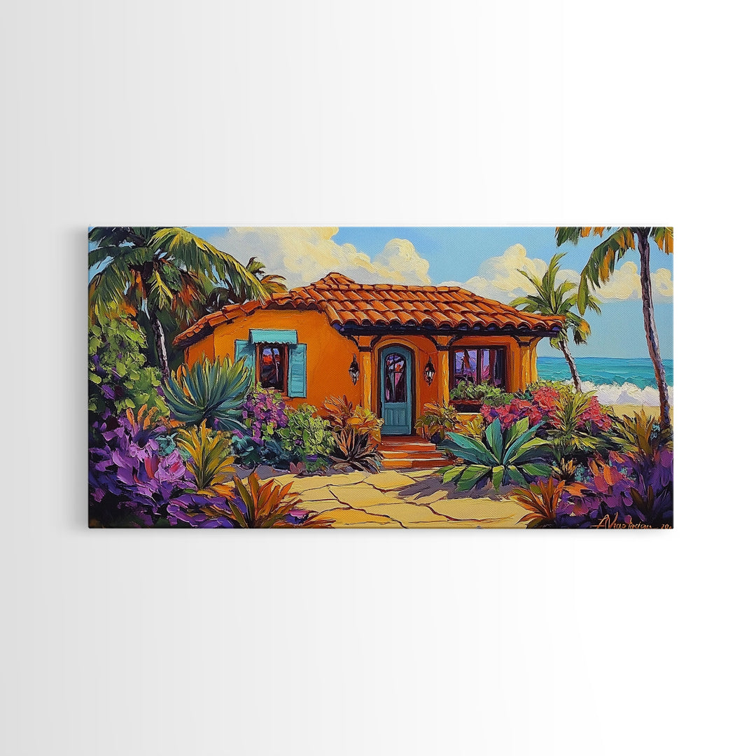 Cottage Palm, Beach, Framed Canvas Print, Coastal Spanish Bungalow Art, Tropical Garden Wall Decor, Beach House Art