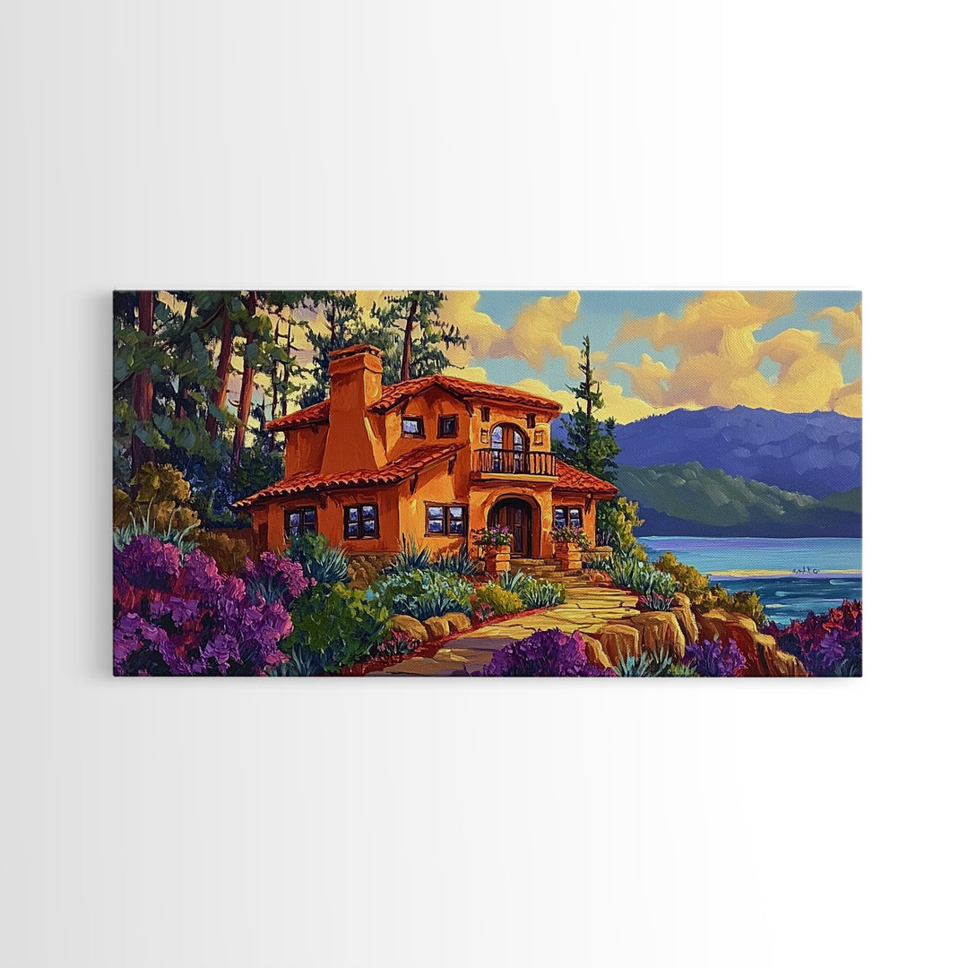Cottage Sunset, Ocean, Warm, Framed Canvas Print, Seaside Cottage Wall Art, Warm Sunset Vibes, Beach House Painting, Vibrant Coastal Decor