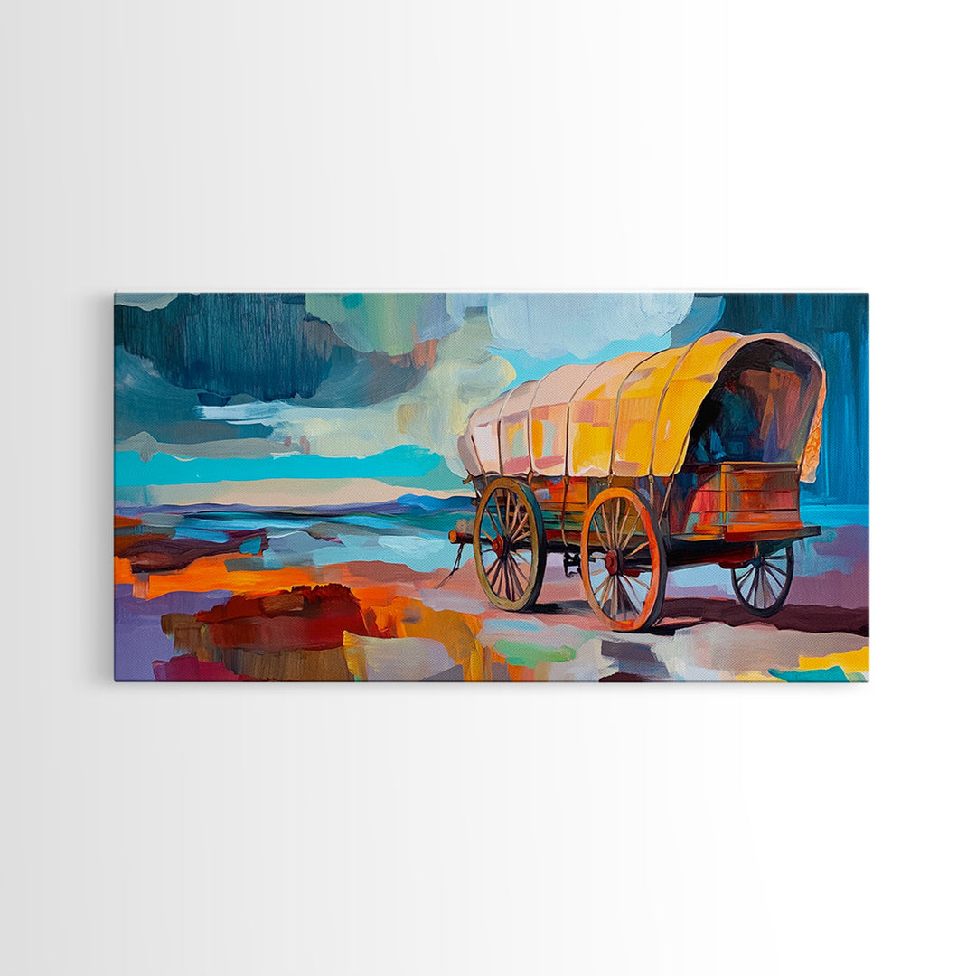 Covered Wagon, Western Landscape, Rustic Decor, Southwest Wall Art, Farmhouse Art, Vintage Horse Art, Panoramic Art, Framed Canvas Print
