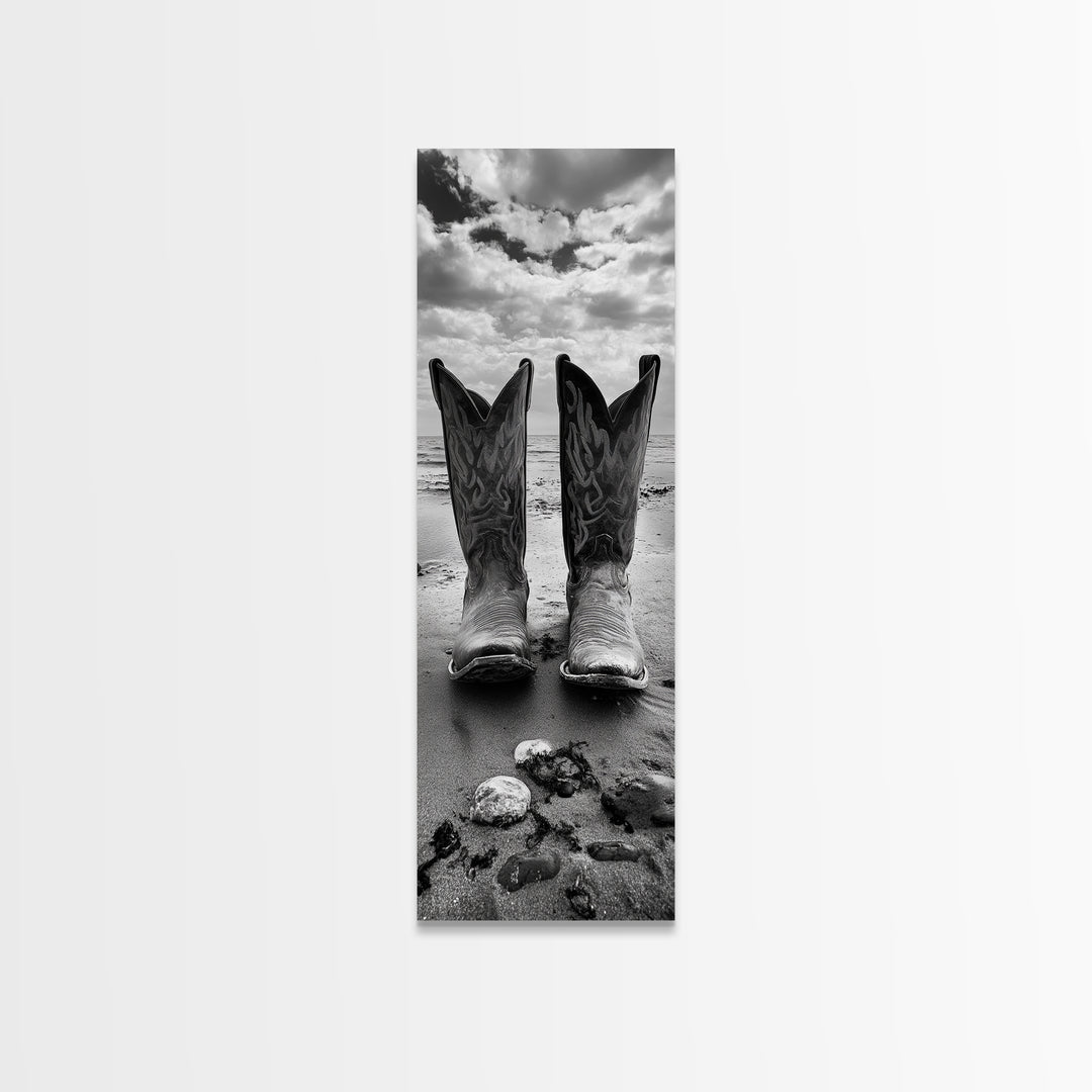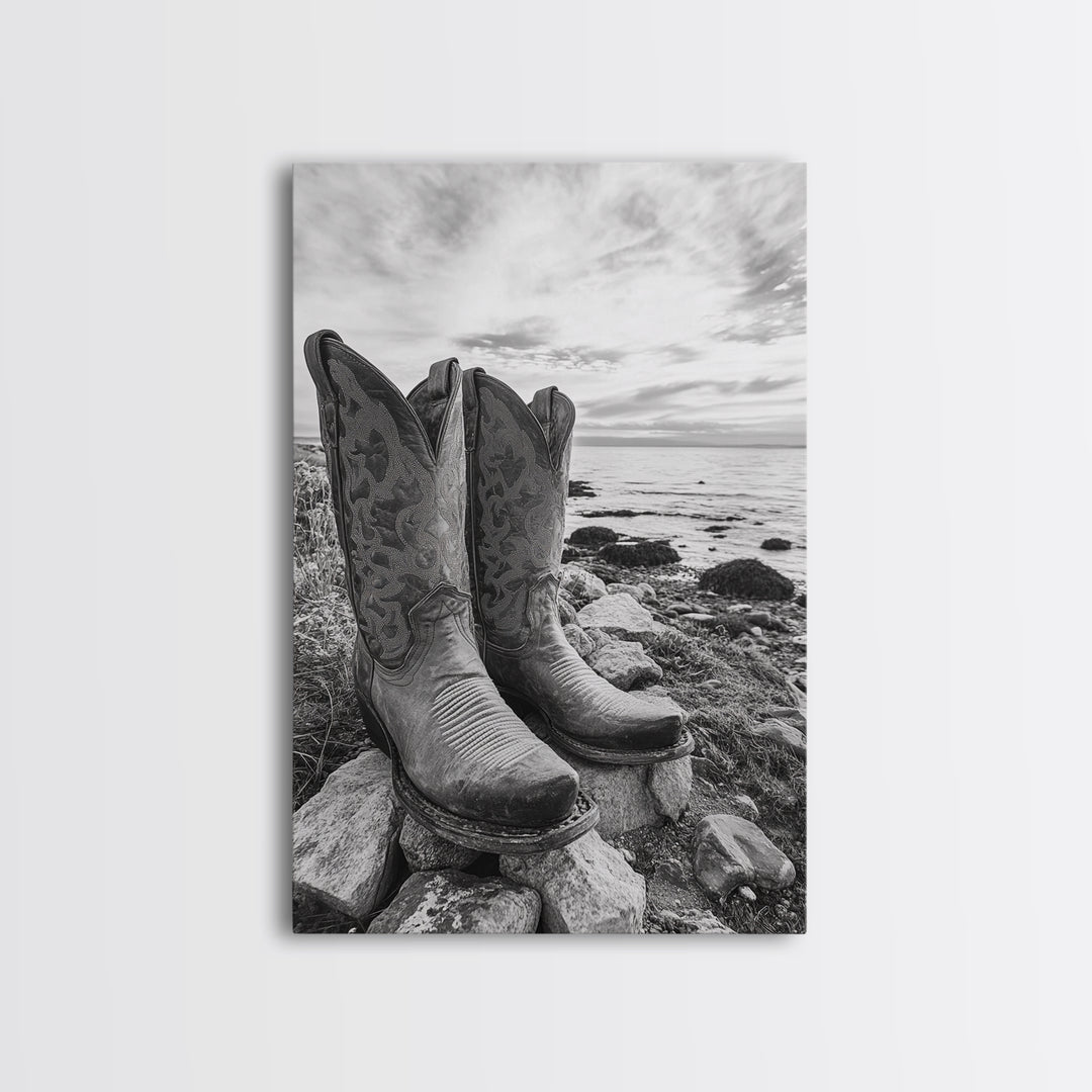 Cowboy Boots, Coastal Cowgirl, Wall Art, Framed Canvas Print, Rustic Décor, Western Artwork, Moody Art, Southwestern Wall Art