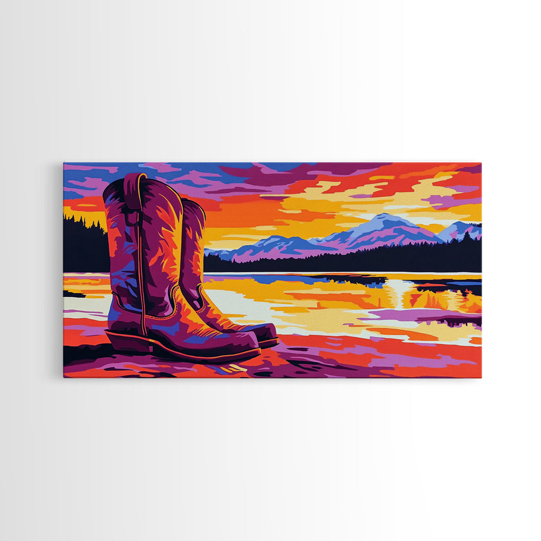 Cowboy boots, lake sunset, mountain painting, rustic western art, farmhouse decor, vibrant colors, extra wide art, canvas print
