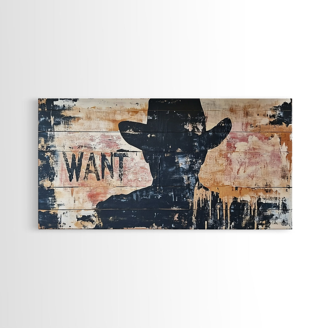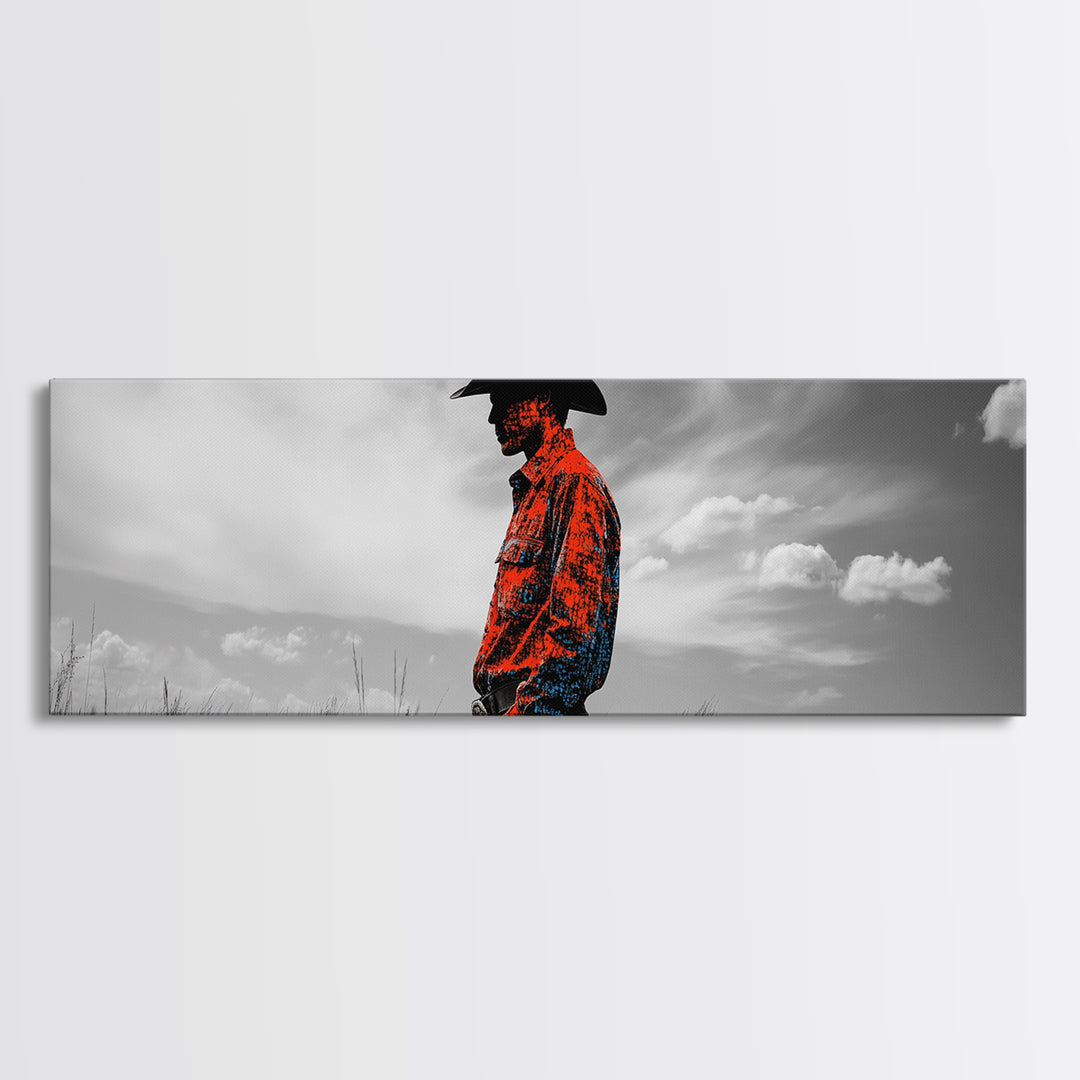 Cowboy Silhouette, Canvas Print, rustic wall art, western decor, farmhouse wall art, extra wide painting, vintage country style