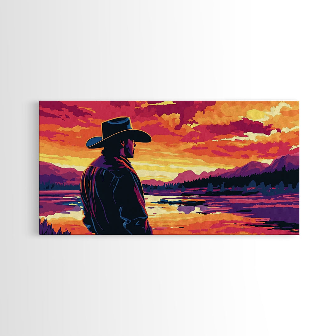 Cowboy Silhouette, Western Art, Southwest Wall Art, Rustic Decor, Moody Art, Framed Canvas Print, Gift Idea, Panoramic Art, Horizontal Wall Art
