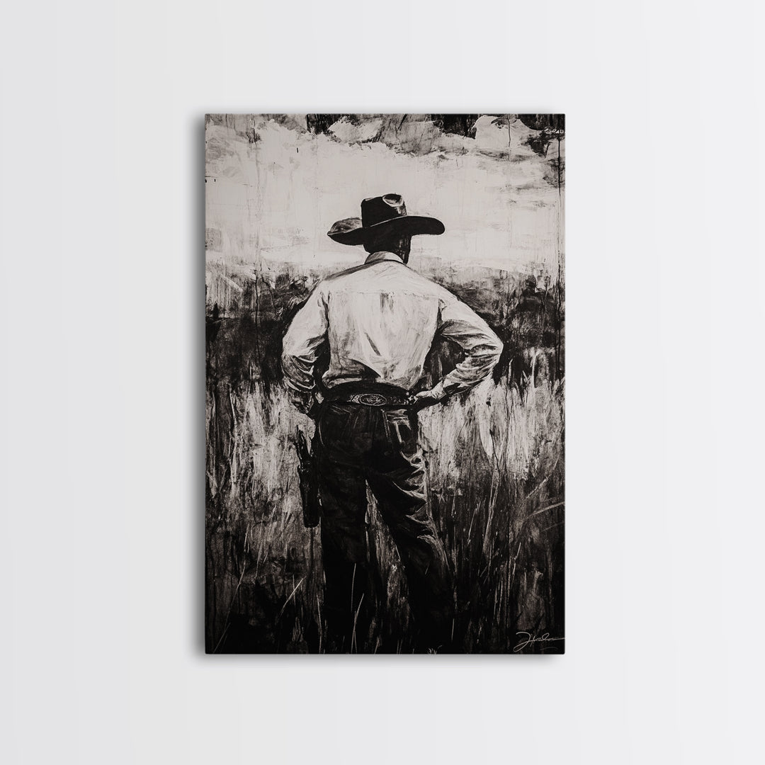 Cowboy Silhouette, black and white art, rustic decor, western painting, farmhouse art, minimalist art, framed canvas print, vintage wall art