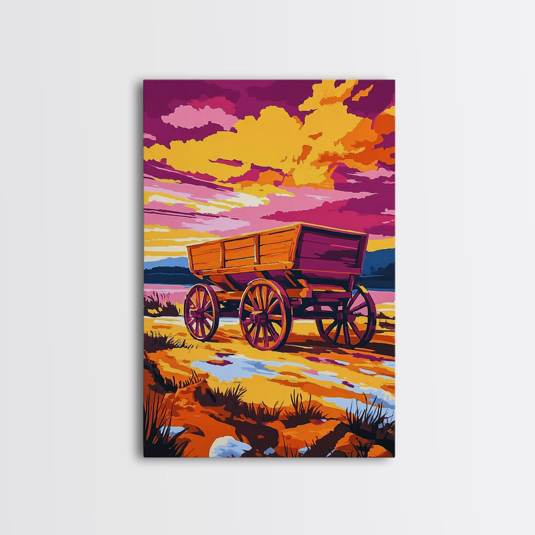 Cowboy Wagon Sunset, vintage horse art, western art, rustic decor, cottagecore wall art, pink orange wall art, Framed Canvas Print