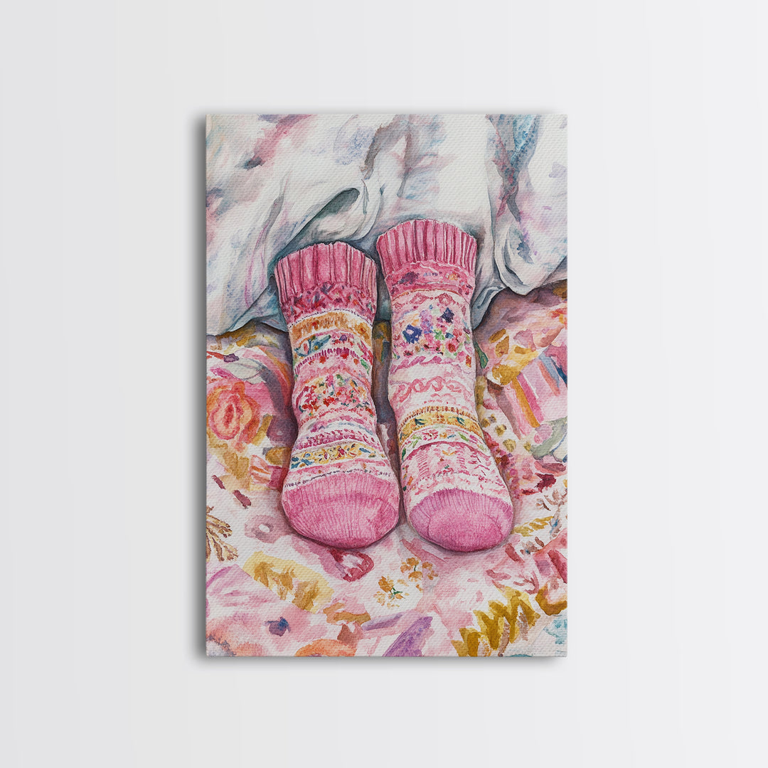 Cozy Socks Watercolor Canvas Print Cottagecore Pink Wall Art Whimsical Bedroom Art Original Painting Rustic Living Room Decor