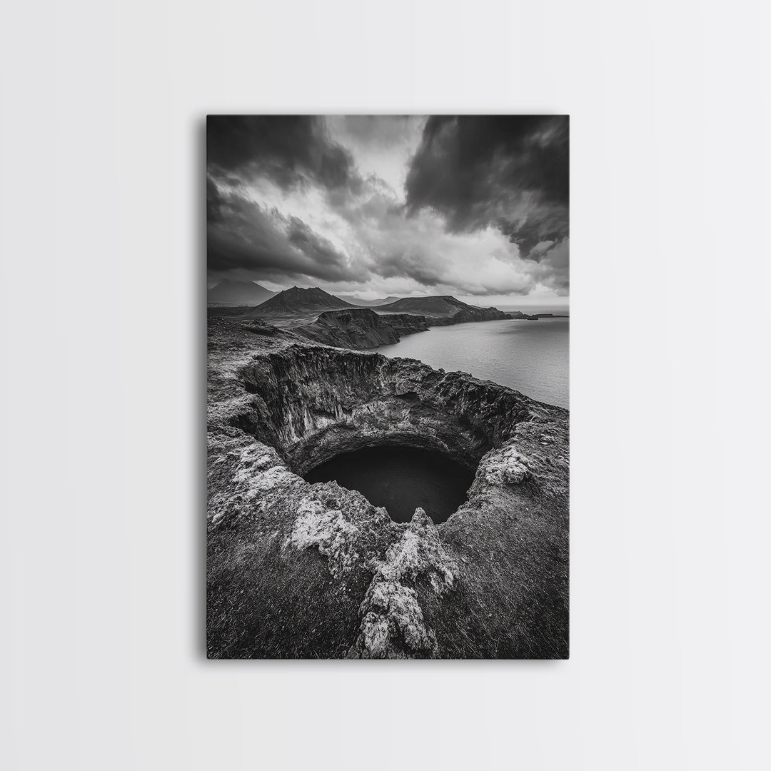 Crater Overlook Coast, Stormy Sky Mountains, Ocean Cliffs, Rugged Wilderness, Canvas Print, Den Wall Art, Moody Black and White Art