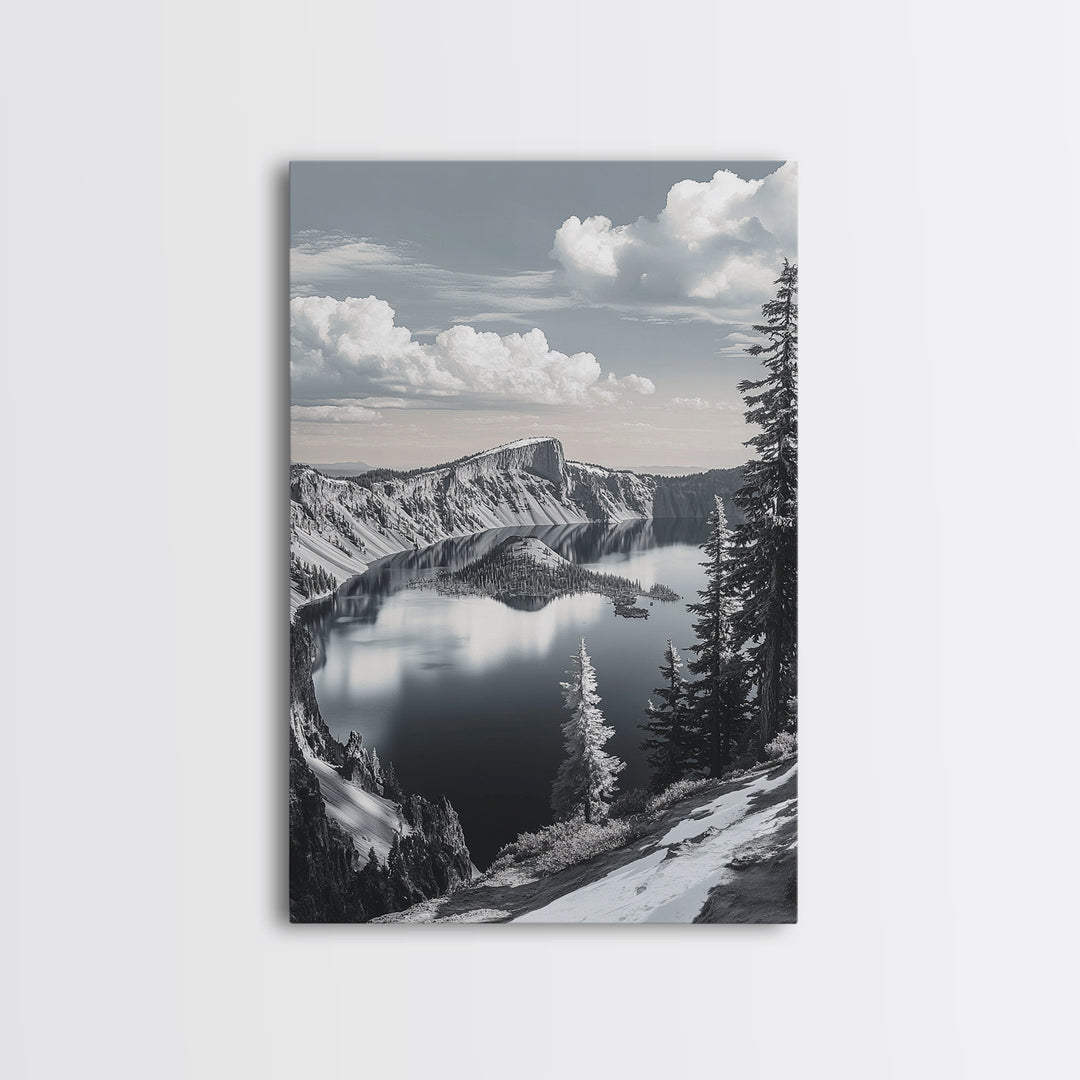 Crater Lake, Snowy Mountains, Scenic Reflection View, Framed Canvas Print, Cabin Wall Art, Winter Landscape Decor, Nature Vibes