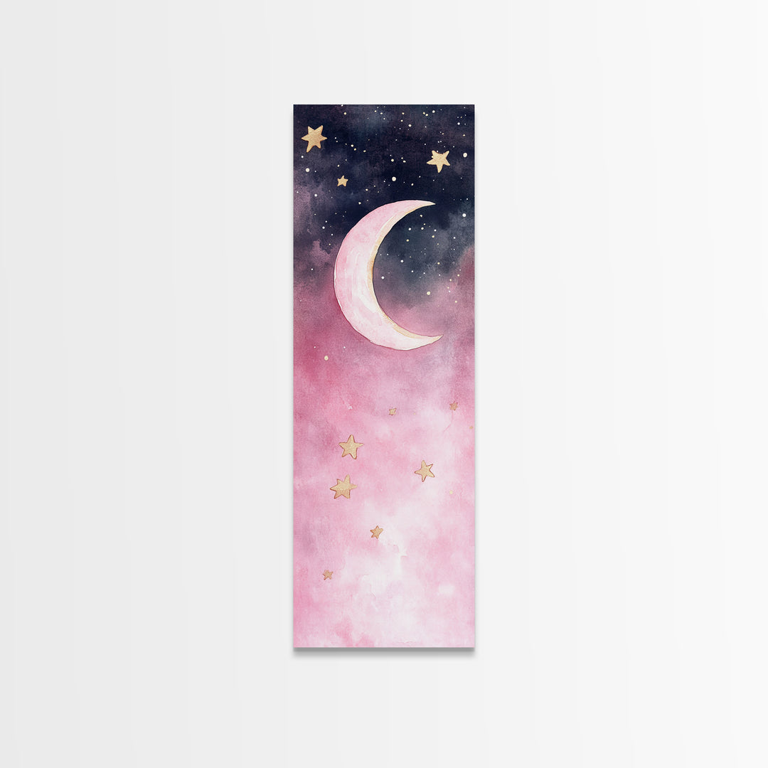 Crescent Moon Canvas Print Starry Night Pink Abstract Vertical Wall Art Zen Room Decor Dreamy Boho Gift Idea
