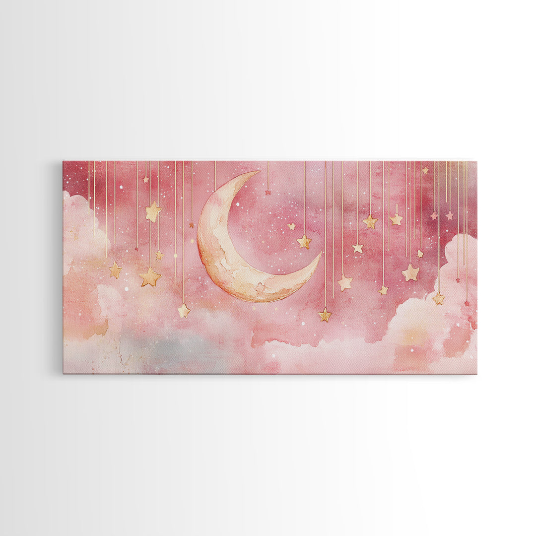 Crescent Moon Nursery Wall Art Canvas Print, Whimsical Pink Starry Sky Art, Light Cottagecore Bedroom Decor Unique Gift Idea