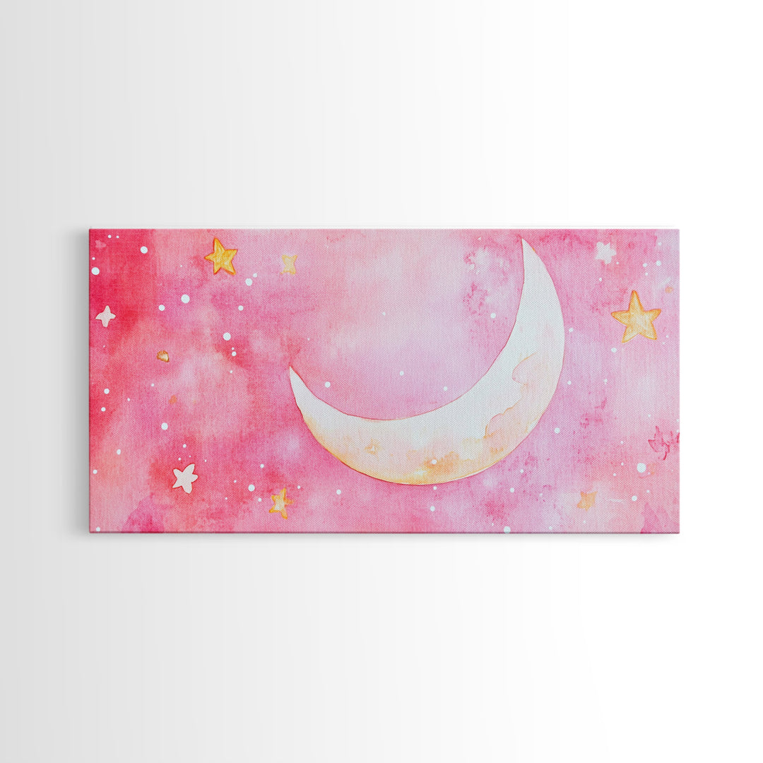 Crescent Moon Painting Canvas Print with Whimsical Starry Sky, Pink Wall Art for Living Room or Guest Room, Dreamy Decor
