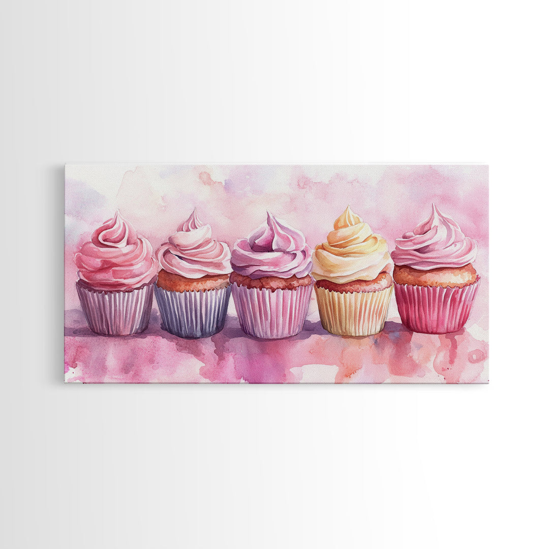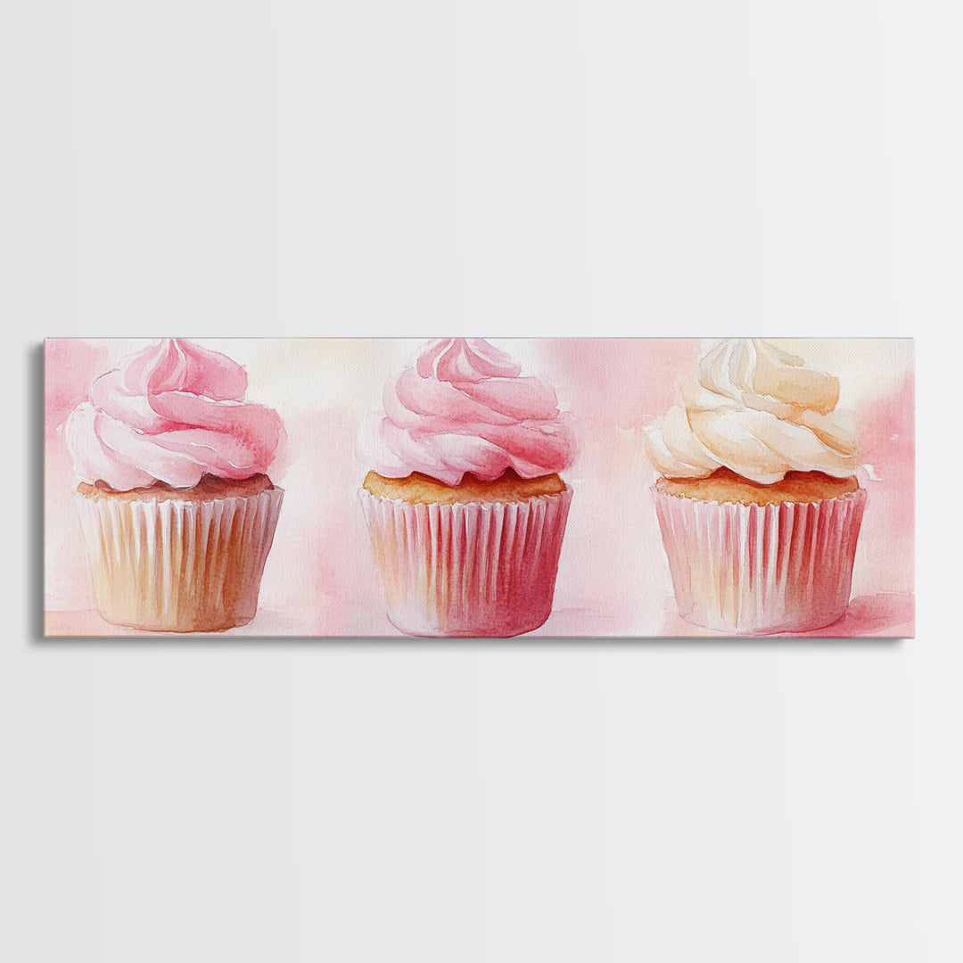 Cupcake Painting Framed Canvas Print Featuring Light Pink Frosting Art, Whimsical Cottagecore Kitchen Decor, Horizontal Artwork Idea