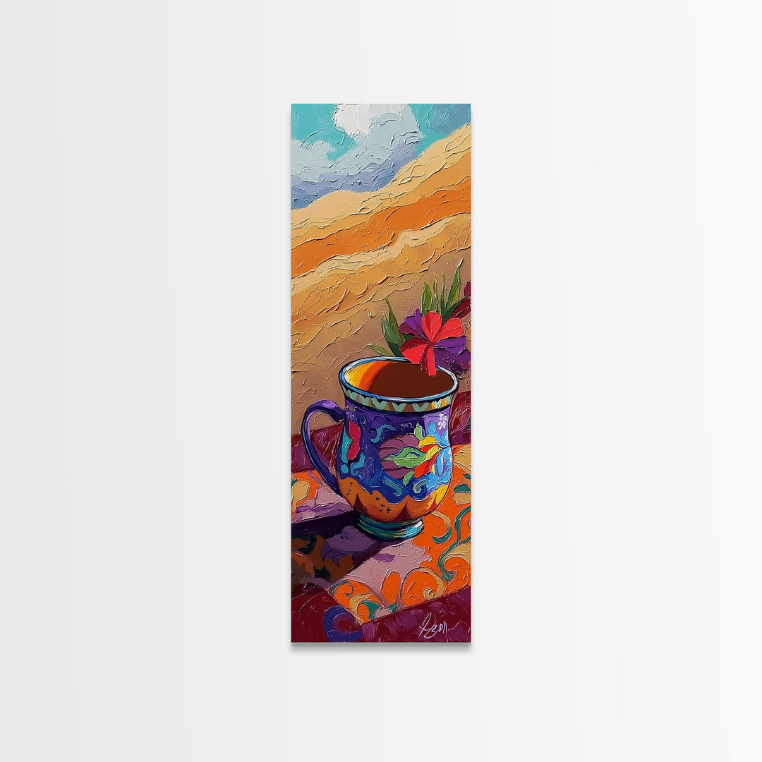 Cup Hibiscus, Coffee, Bold - Framed Canvas Print coffee lover gift, tropical mug painting, breakfast nook decor, colorful boho wall art