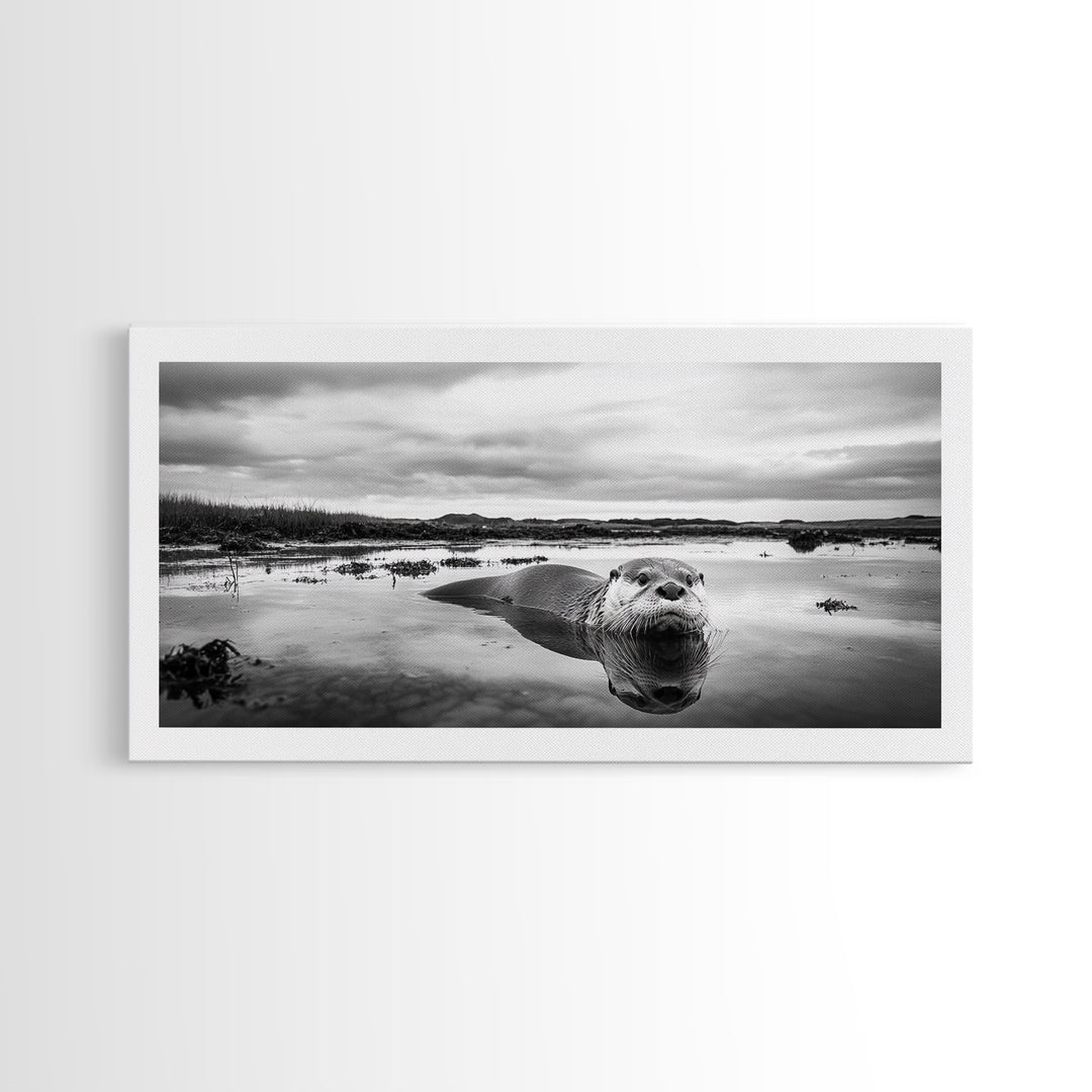 Curious Otter, Coastal Wildlife, Black and White, Animal Photography, Framed Canvas Print, Bathroom Wall Art, Nature Lover Gift