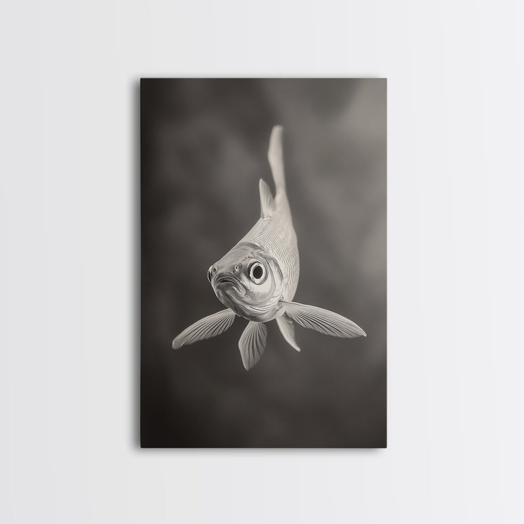 Curious Fish, Underwater Focus, Moody Marine Life, Framed Canvas Print, Bathroom Wall Art, Black and White Ocean Wildlife Decor
