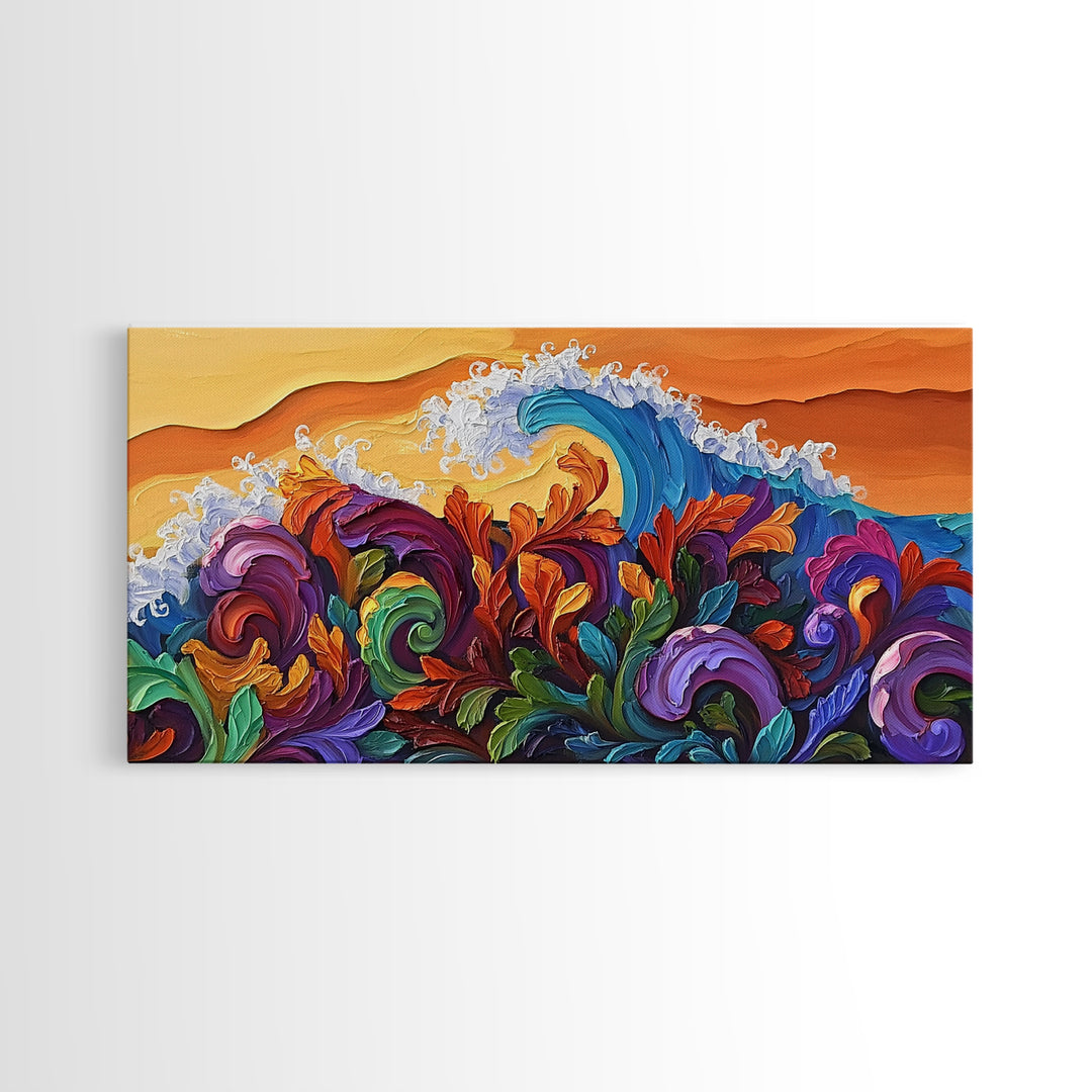 Abstract Wave, Fiery Floral Splash, Boho Landscape Art, Framed Canvas Print, Bold Living Room Statement Wall Decor