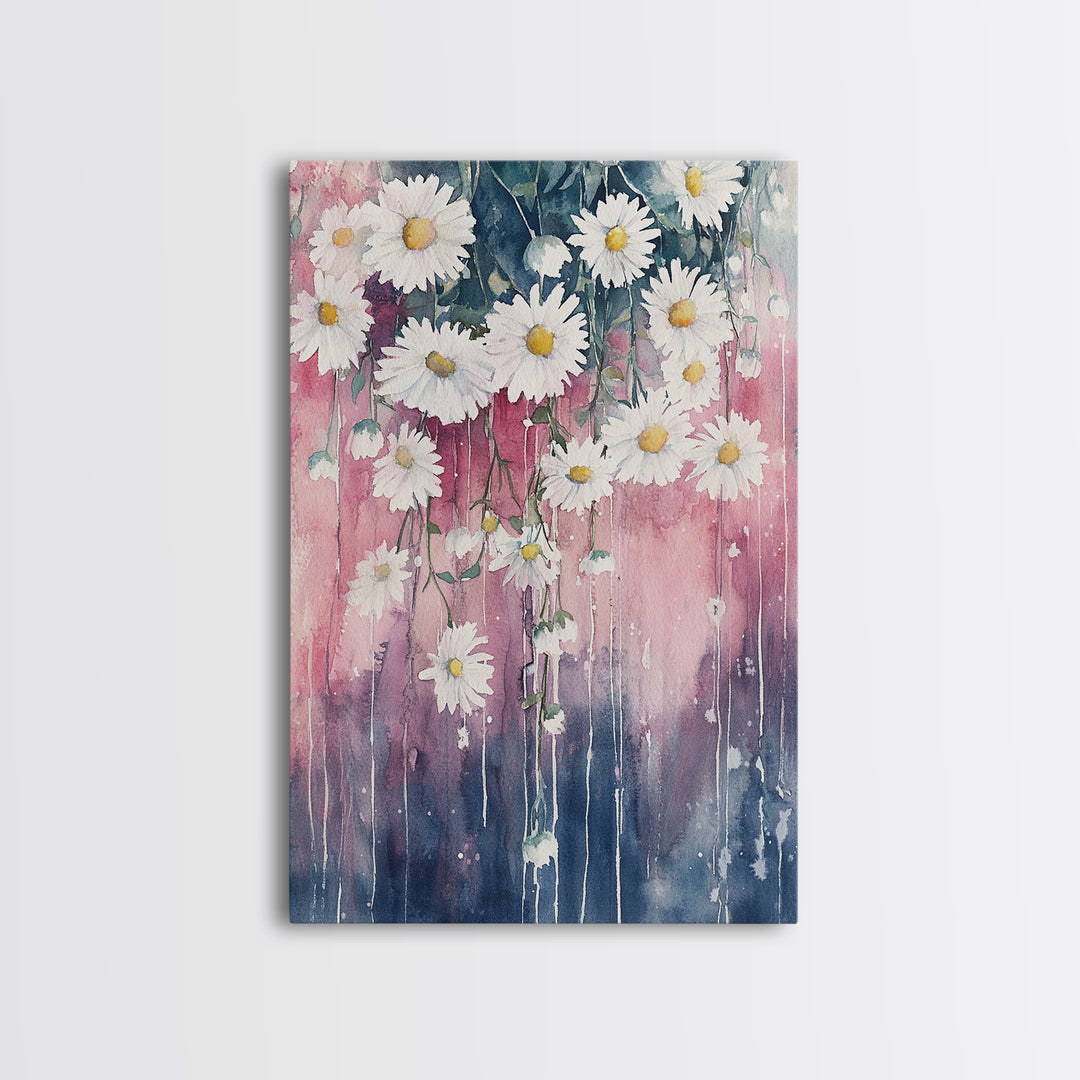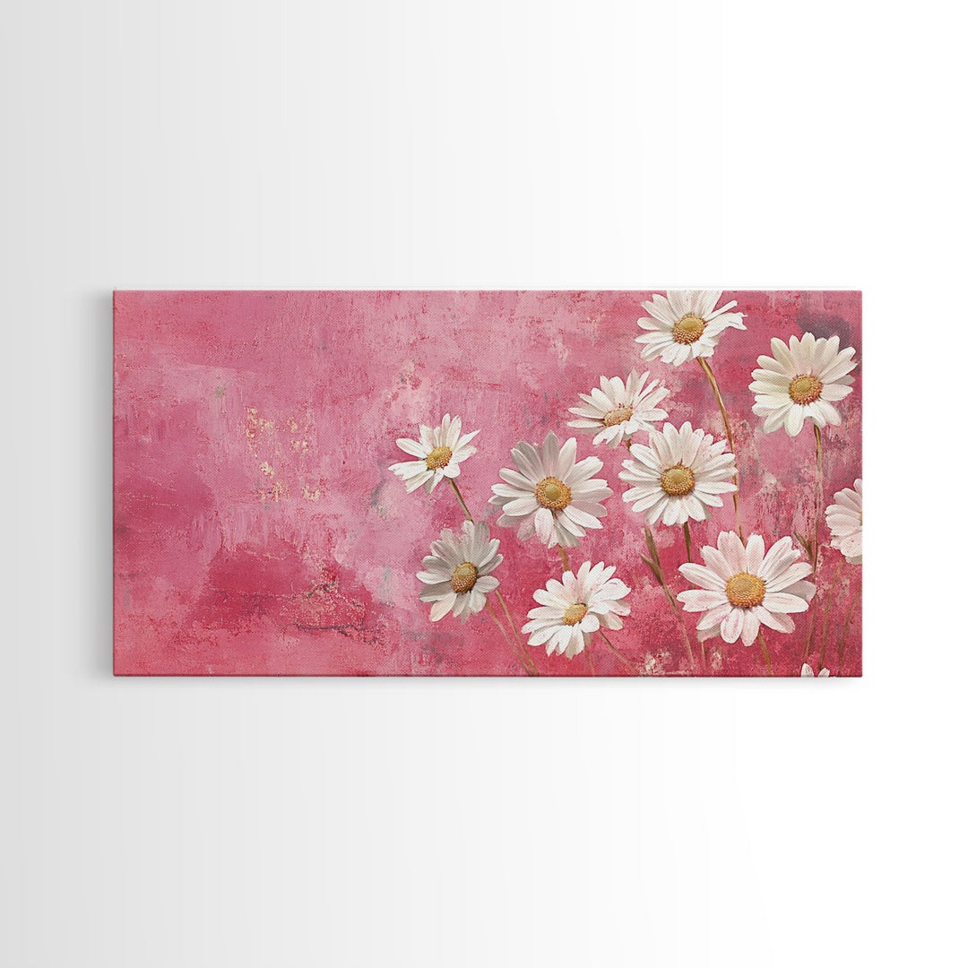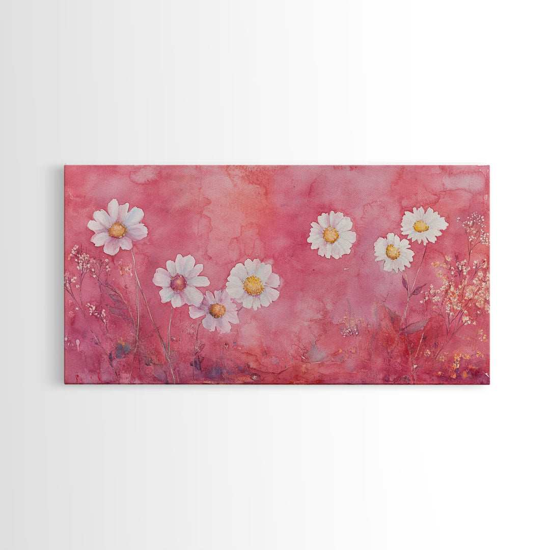 Daisy Wildflower Painting Framed Canvas Print, White Daisy Flowers on Pink Background, Rustic Cottagecore Wall Art Living Room Decor