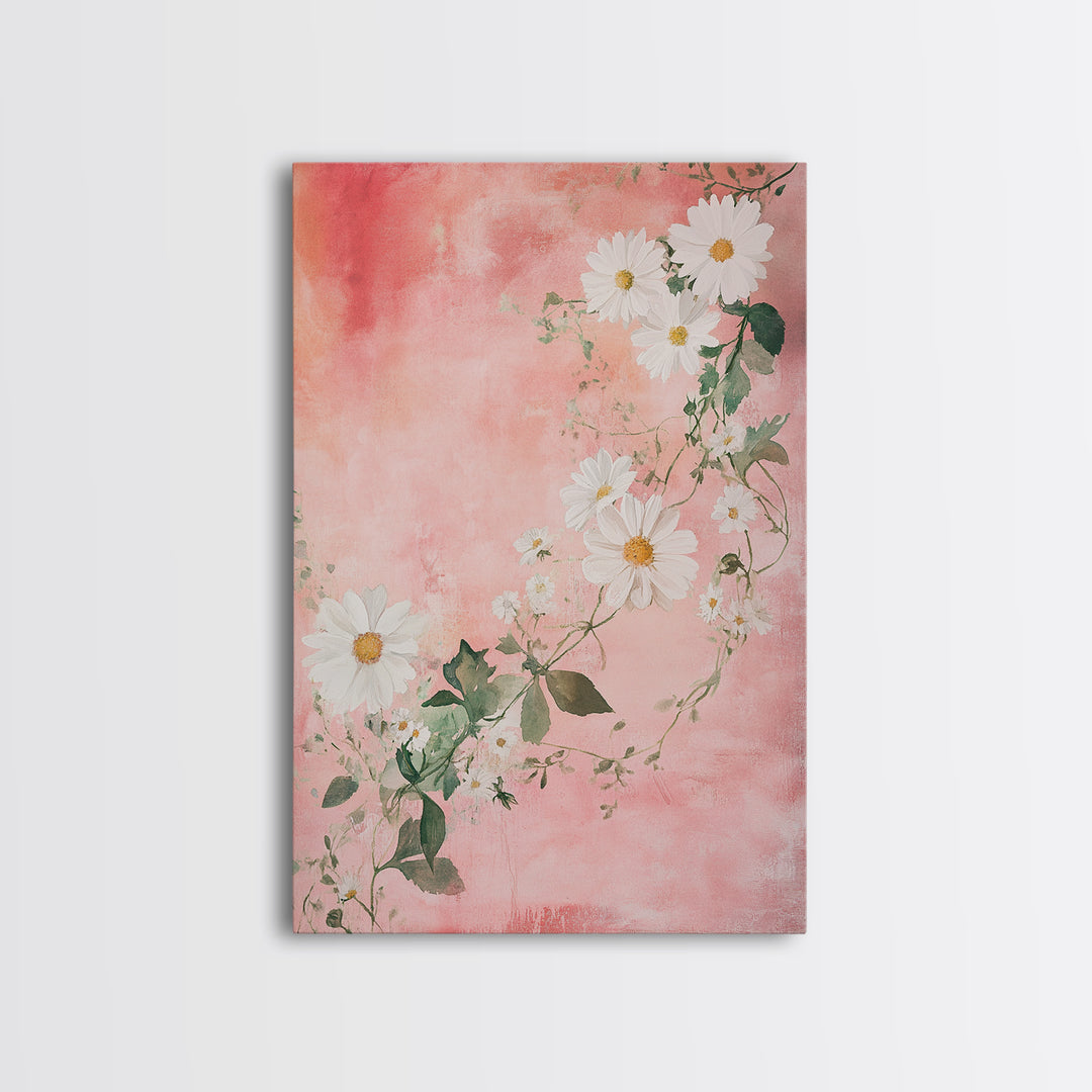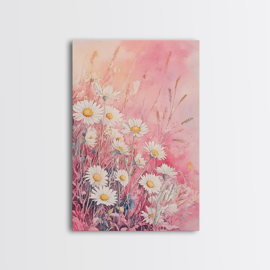 Daisy Wildflower Framed Canvas Print, Rustic Pink Background Art, Cottagecore Floral Style, Soft Pastel Home Decor, Nature-Inspired Gift
