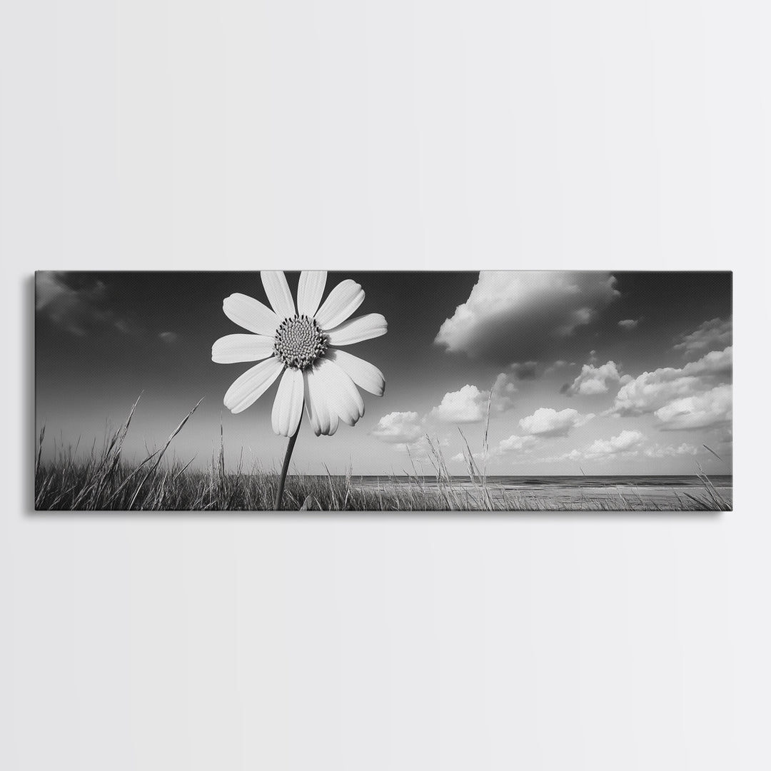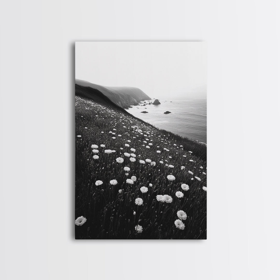 Daisy Cliffside Bloom, Coastal Flowers, Peaceful Nature Scene, Framed Canvas Print, Bedroom Wall Art, Botanical Decor, Minimalist Style