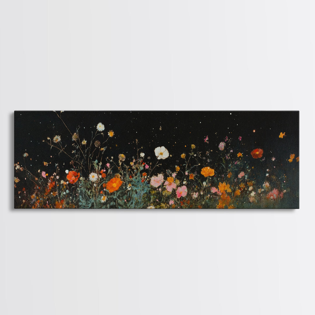 Dark & Moody Wild Flowers At Night, Framed Canvas Print, Panoramic Thought Provoking Wall Art, Above Bed Art, Dark Floral Painting