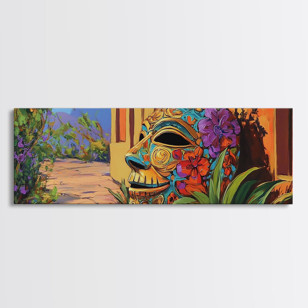 Day of The Dead Inspired Mexican Canvas Painting Framed, Long Narrow Wall Art Print, Spanish Style Home Decor, Contemporary Art Print