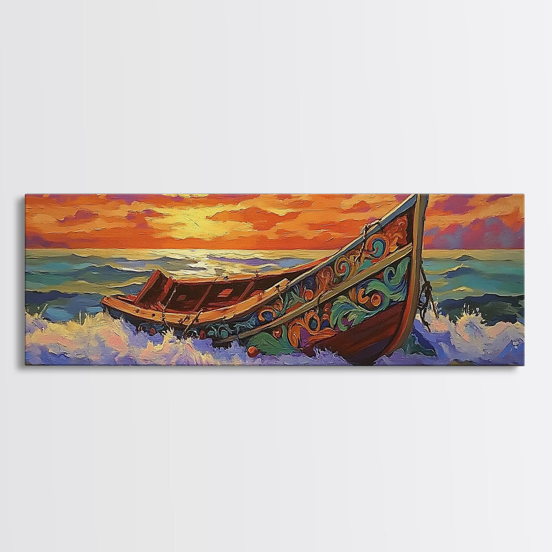 Decorative Boat Art, Ornate Vessel Scene, Colorful Nautical Sunset, Seaside Folk Charm, Framed Canvas Print, Living Room Coastal Art