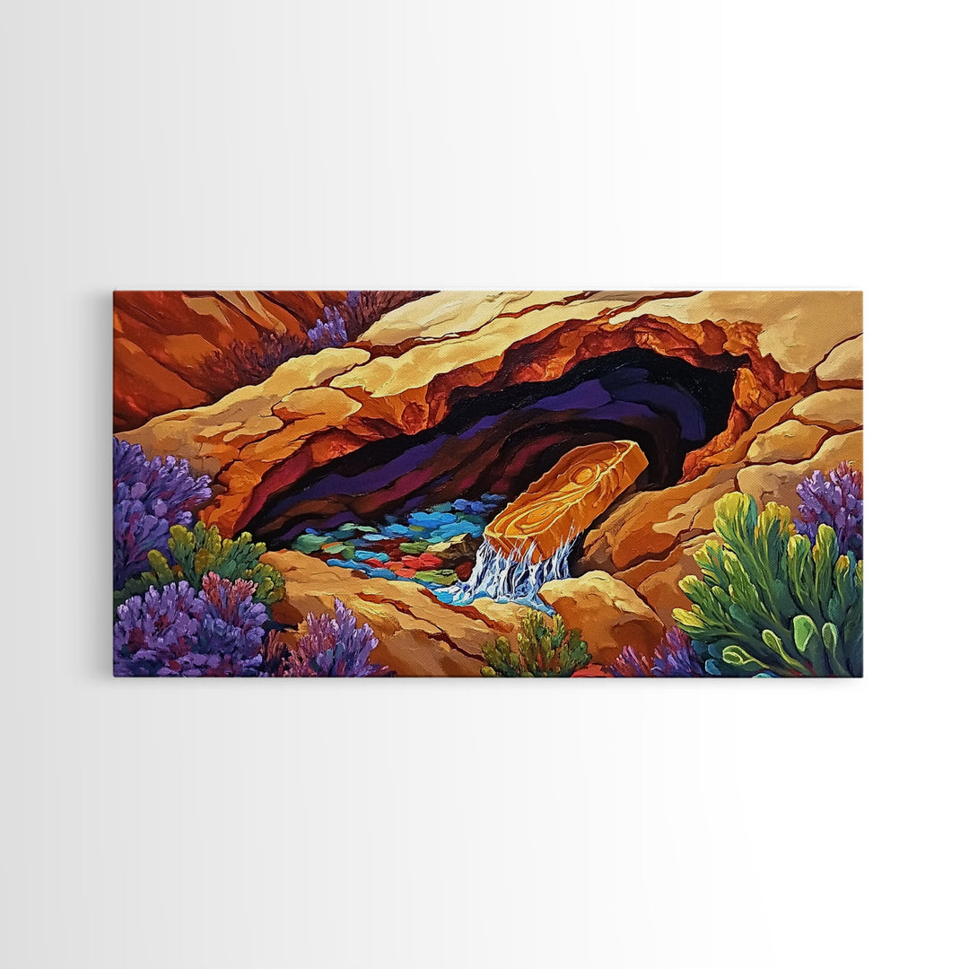 Desert Hidden, Oasis, Waterfall, Framed Canvas Print Nature-inspired boho landscape, colorful living room wall art, southwest decor