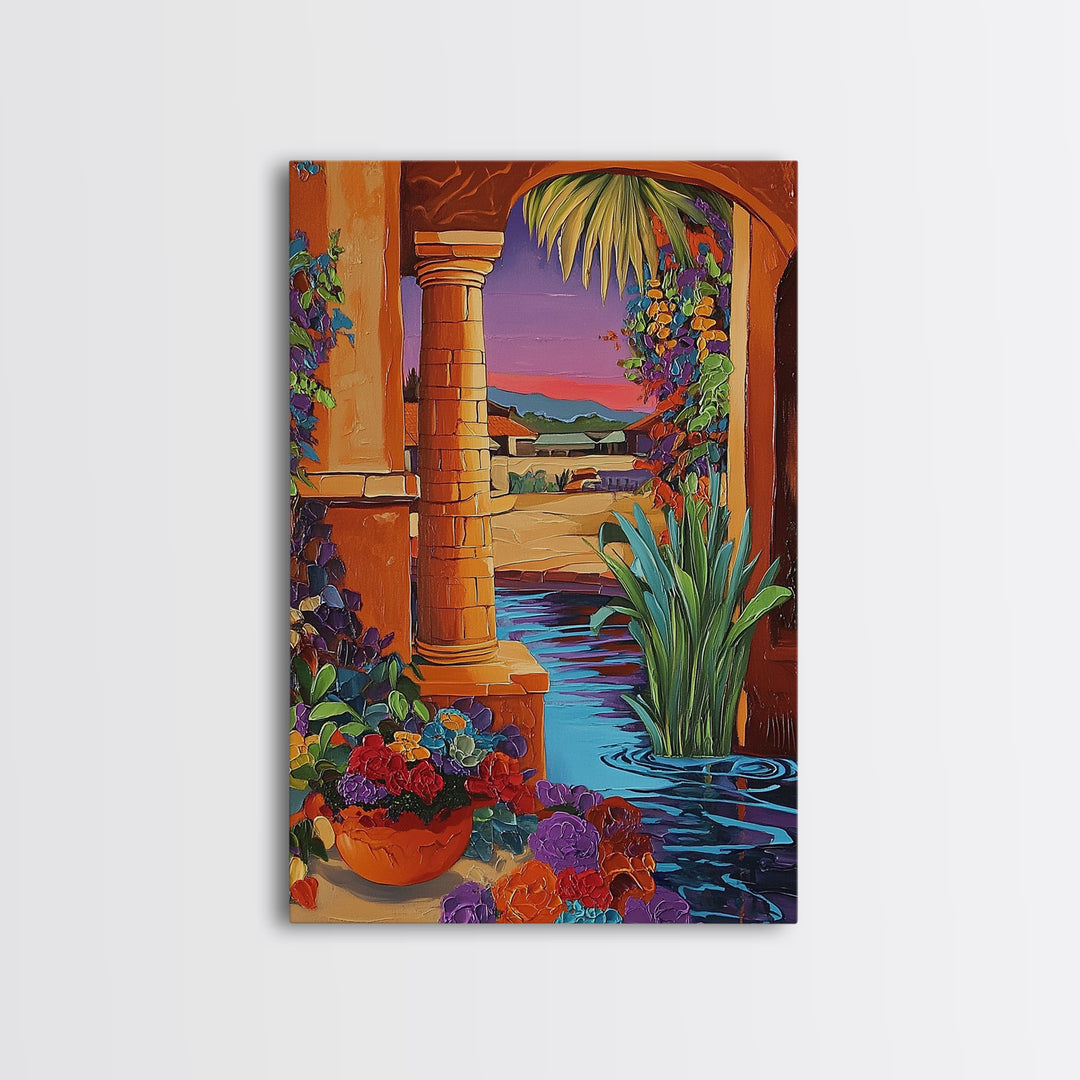 Desert Garden View, Vibrant Sunset Patio, Mexican Courtyard Scene, Framed Canvas Print, Colorful Patio Art, Kitchen Wall Art, Boho Decor
