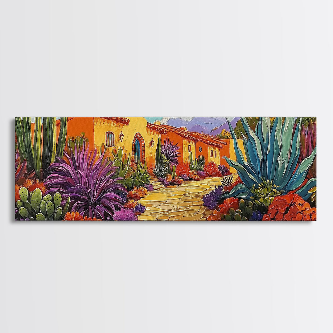 Desert Garden, Adobe Home, Cactus Pathway, Colorful Southwest, Framed Canvas Print, Kitchen Wall Art, Boho Western Decor, Vibrant Desert Scene