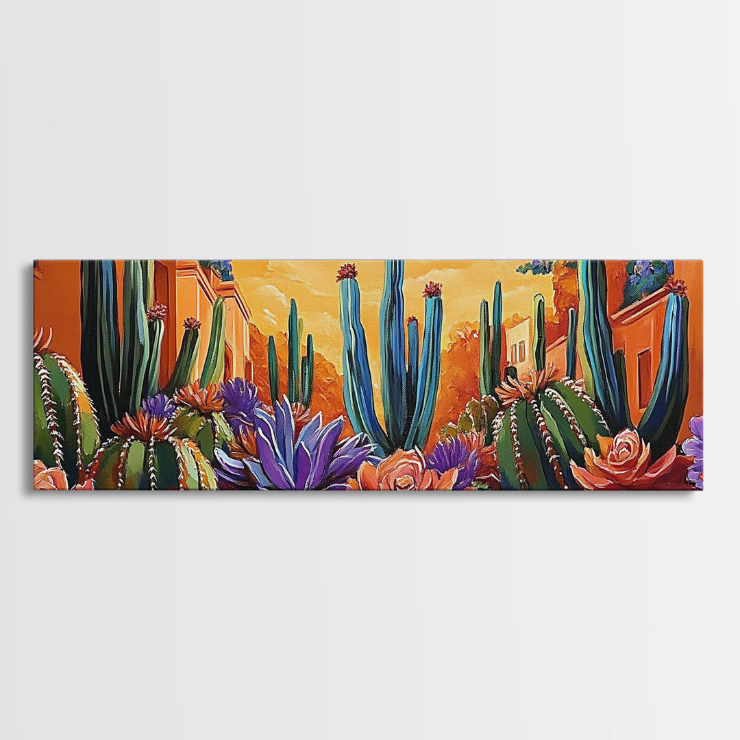 Desert Garden Magic, Colorful Cactus Landscape, Urban Nature Art, Framed Canvas Print, Living Room Southwest Decor, Boho Sunset Wall Art
