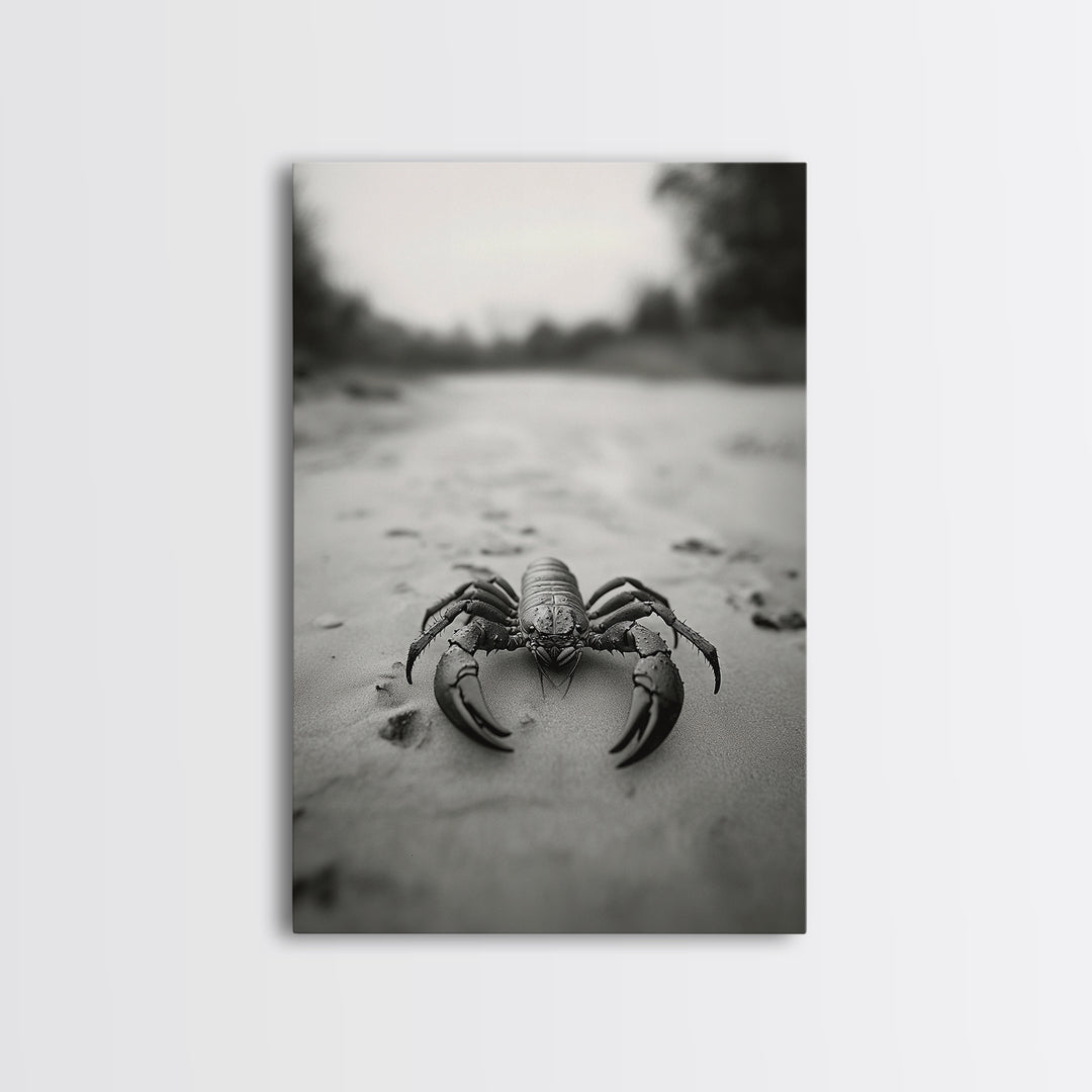 Desert Scorpion, Moody Wildlife, Sandy Ground, Focused Predator, Framed Canvas Print, edgy boho decor, masculine wall art, nature closeup